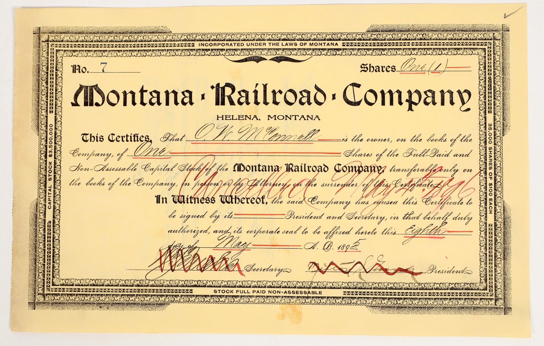 This is a single stock certificate for the Montana Railroad Company centered in Helena dated 1895. Cancelled. Please see photo for details.