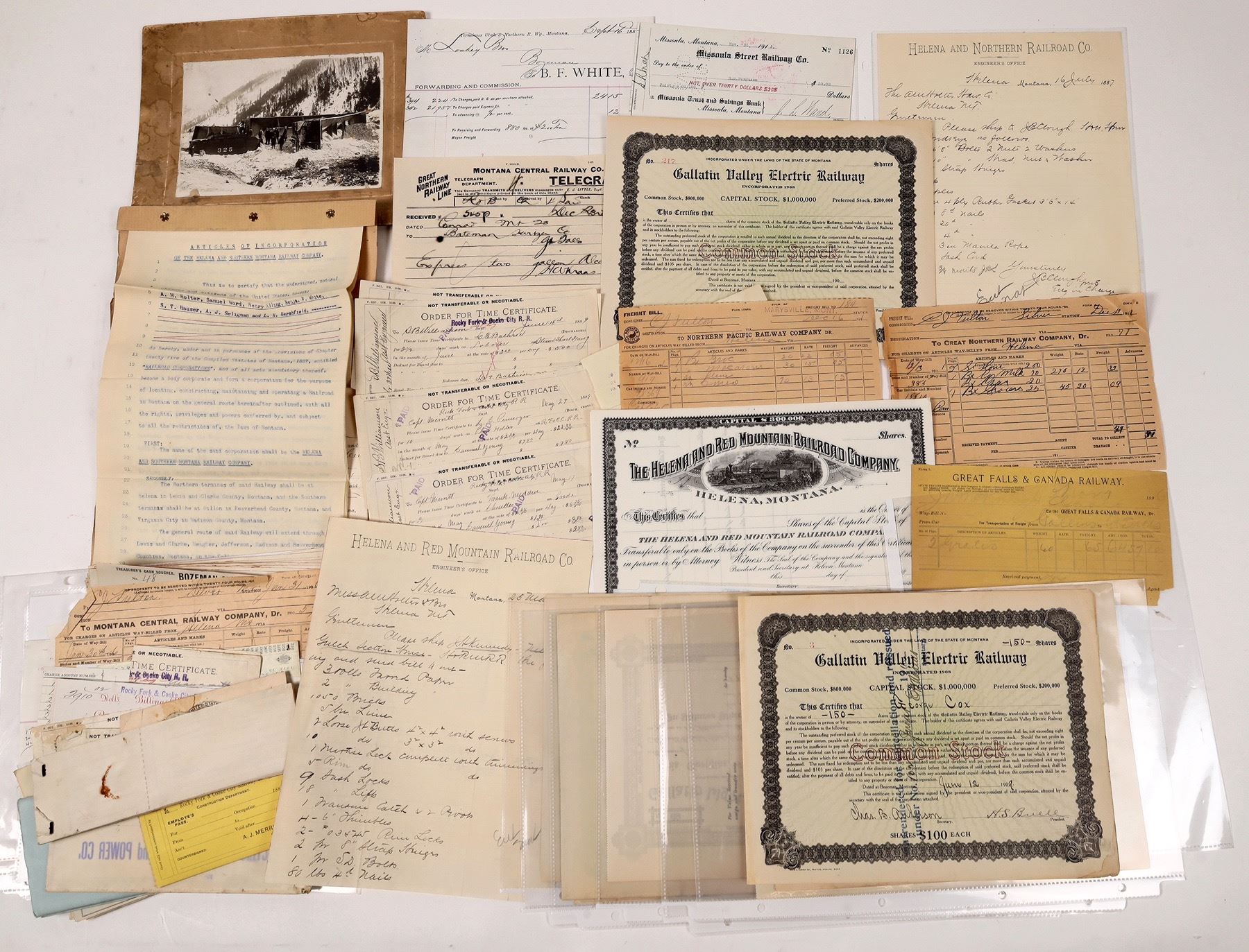 Variety of Montana railroad ephemera including billheads, freight receipts, stock certificates, checks, articles of incorporation of the Missouri River Railway Company and the Helena and Southern Montana Railway Company, one photograph, and more. These pieces are from the late 19th and early 20th centuries. Some of these pieces are from rare railroads. Various sizes from about 4.5 x 2.5 and 11 x 8.25 inches, good condition. Approx. 100 pieces.