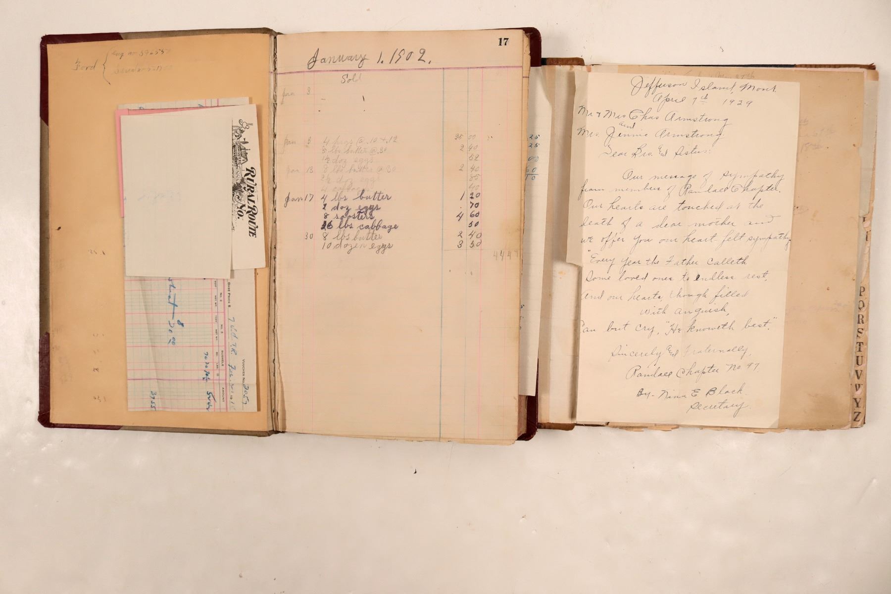 2) Copy book. About 40 pages. Reference to poison, thrashing and cutting, etc. 3) A few miscellaneous papers: like a 1929 letter from Jefferson Island, Montana and a bill with an attached to a Rrural Route No. small letter head with fabulous wagon post office delivery truck vignette. c1902-1926. Pages missing. Daily expense book. Roughly 65 pages used. 1902-1906. City: State: Montana Date: