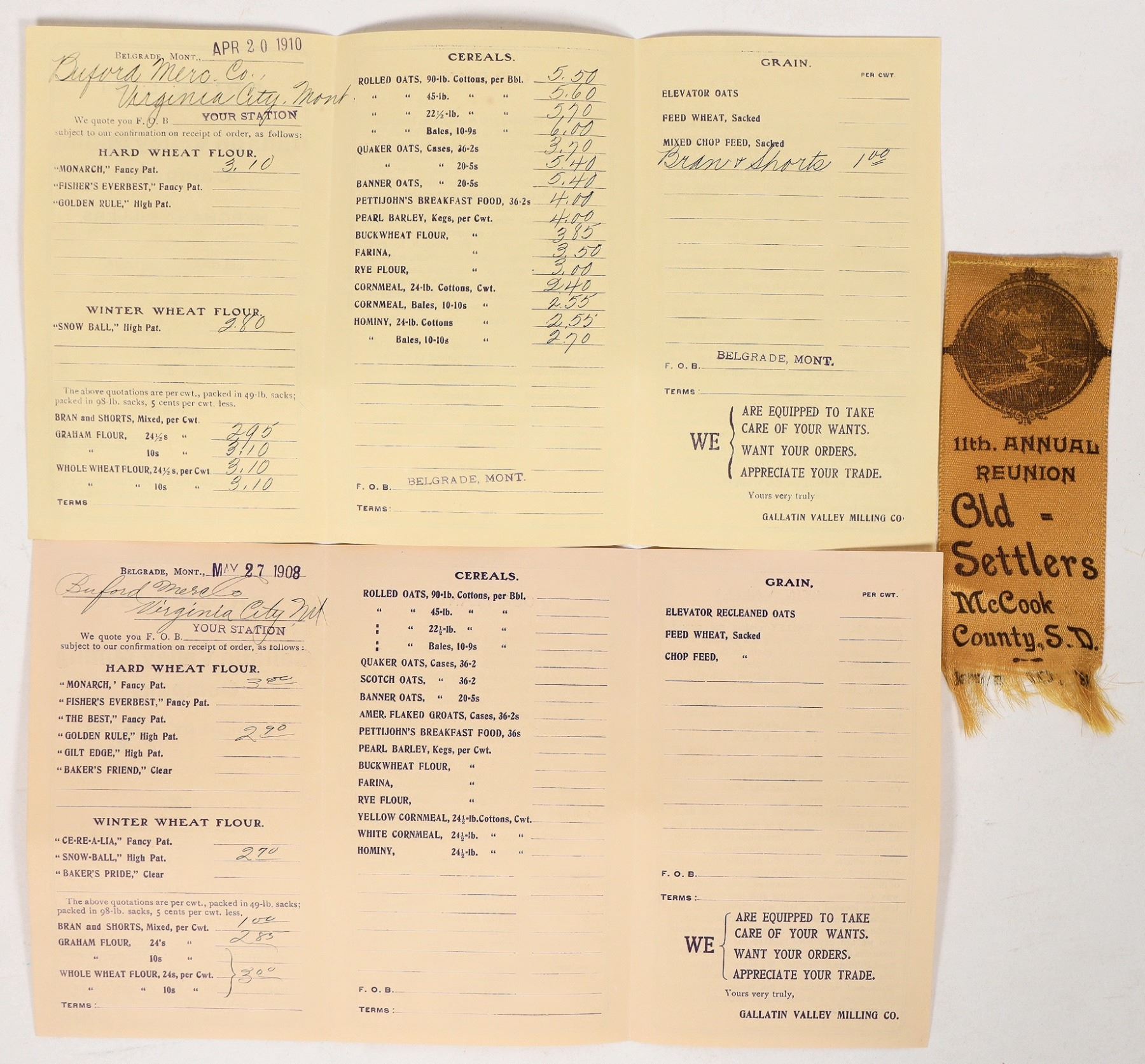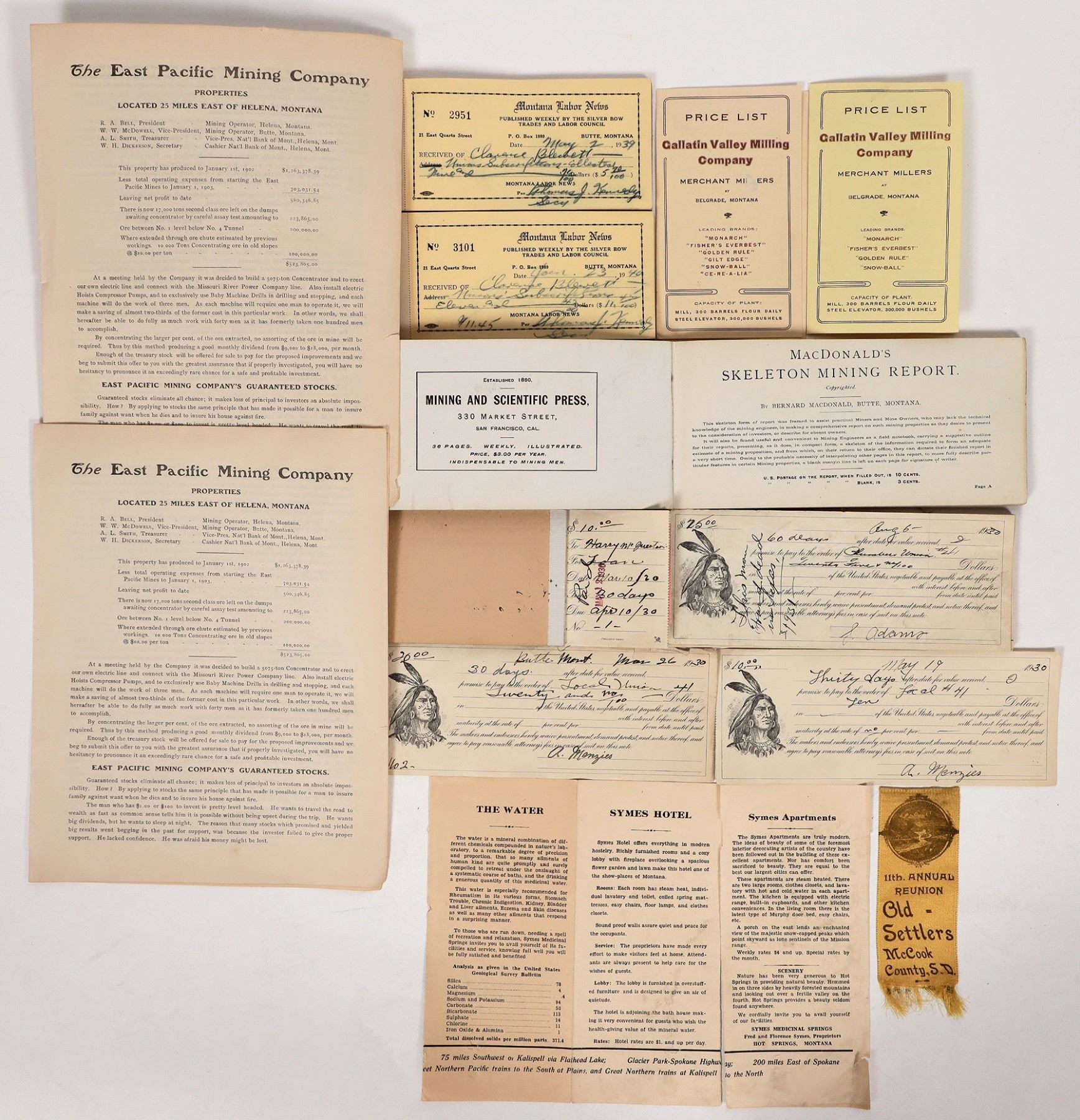 2x 1930 Butte checks, Old Settlers 11th annual reunion ribbon, 2x Gallatin Valley Milling price lists, 2x East Pacific Mining reports, MacDonald's skeleton mining report book-unused, 1930 Butte Montana Miners Union? checkbook, 1939 and 1940 Montana Labor News receipt books.