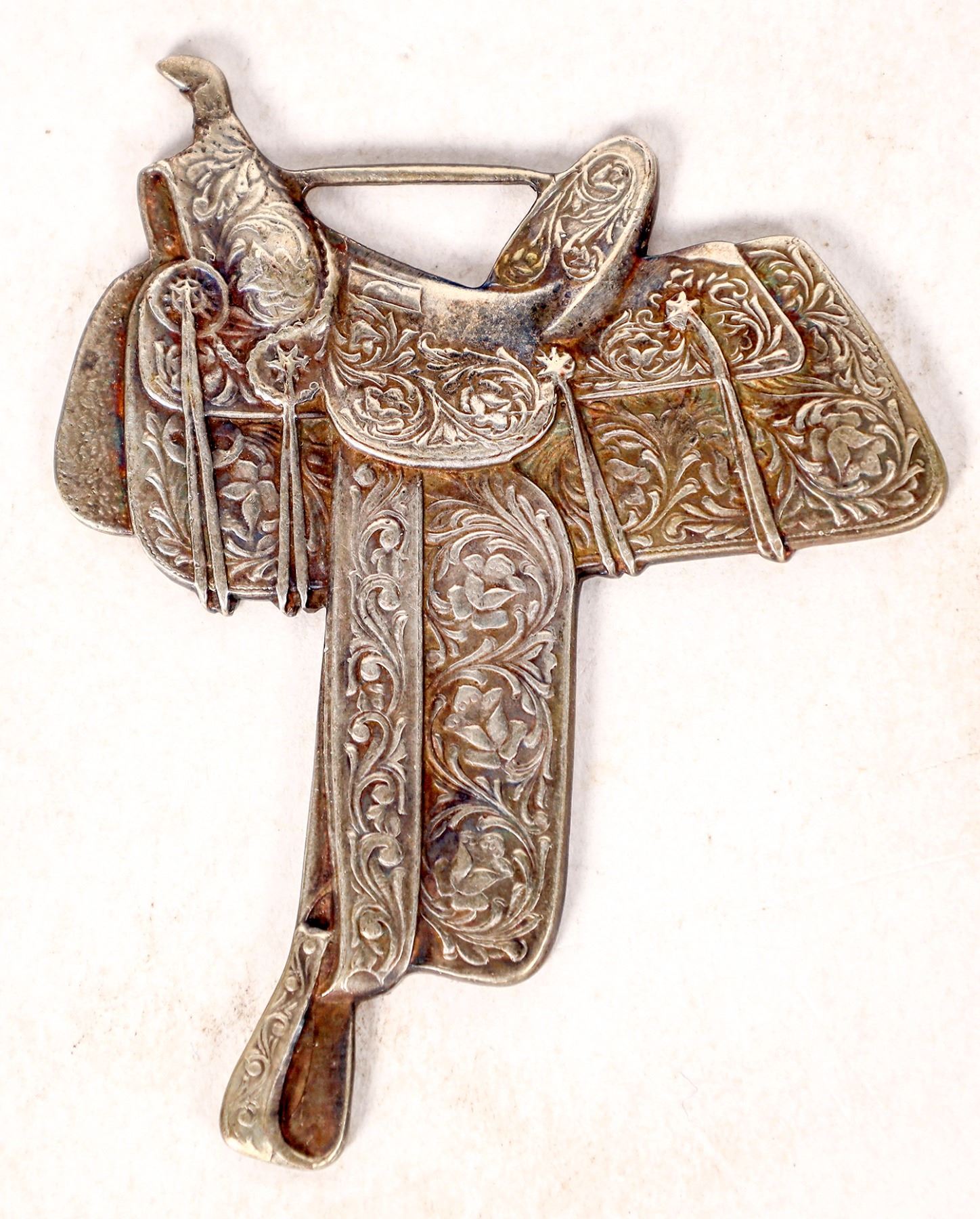 2 prominent Montana white metal saddlery fobs, 2x1.6". Miles City/Saddlery Co./Makers of the/Original Coggshall Saddle/Miles City/Mont. Al. Furstnow/Originator of Saddle/That Made/Miles City/Famous. Miles City Montana