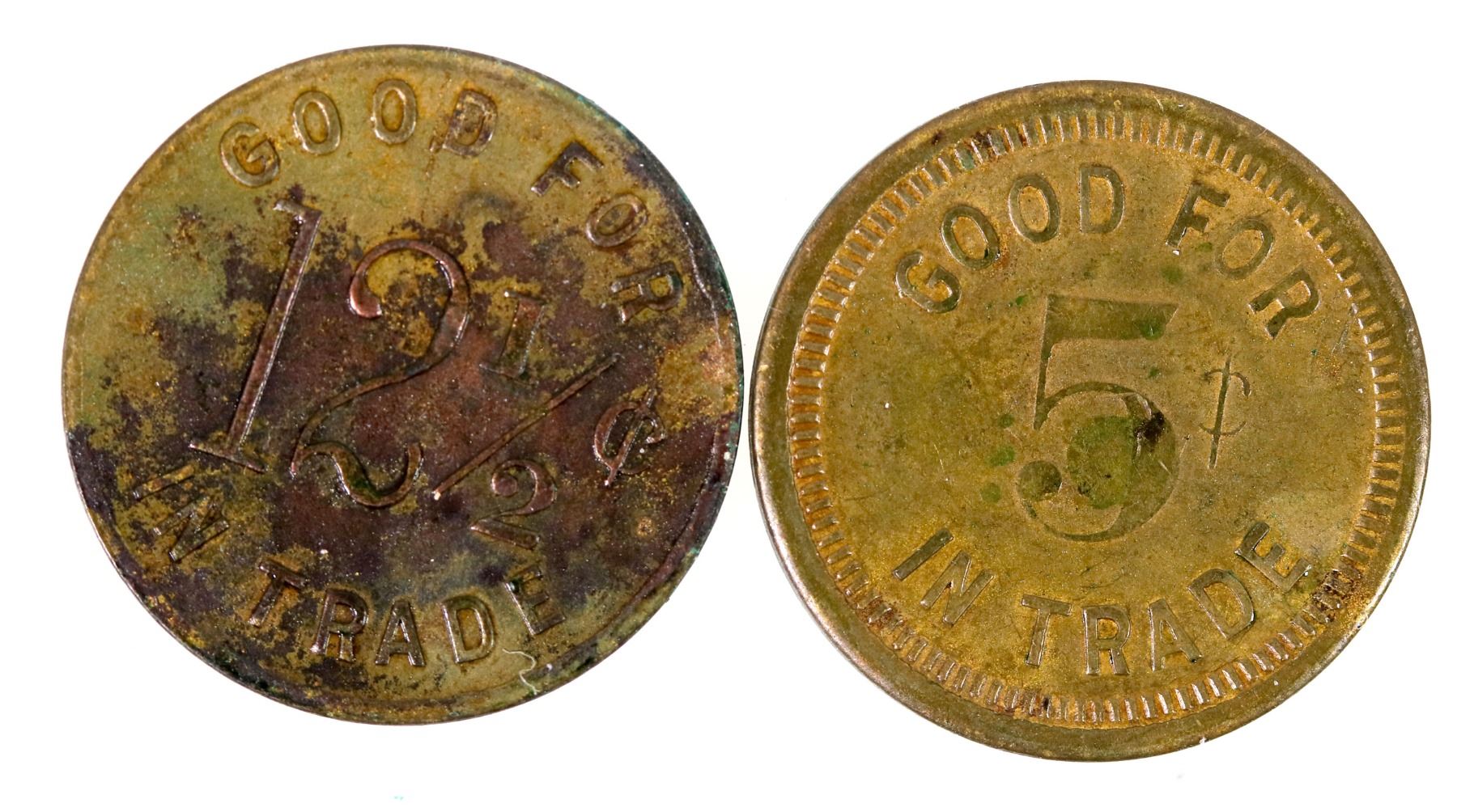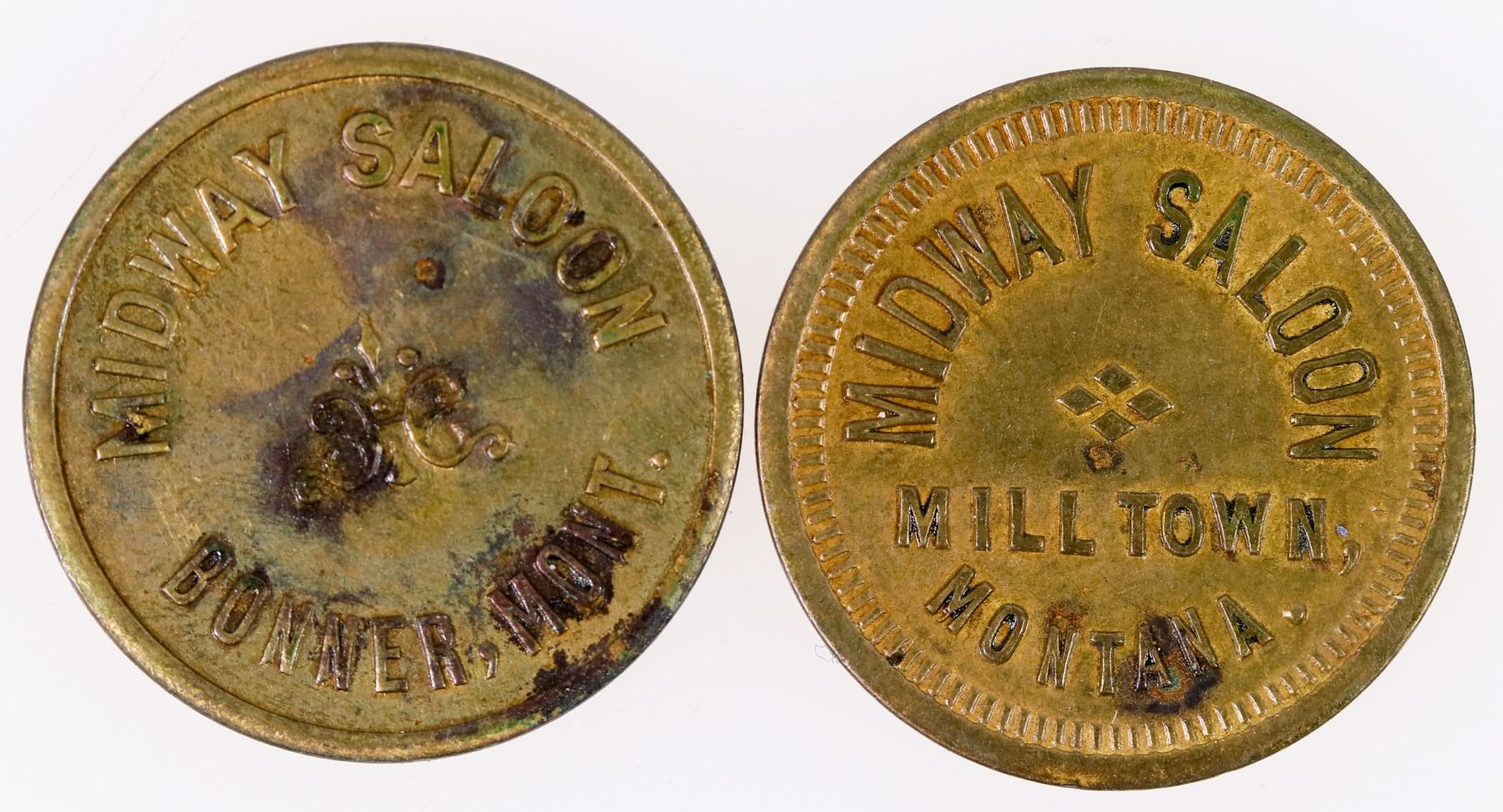 Lot of two: 1) MIDWAY SALOON / MILLTOWN, / MONTANA. // GOOD FOR / 5c / IN TRADE; Br. ,rd., 21 mm. 2) MIDWAY SALOON / BONNER, / MONTANA. // GOOD FOR / 5c / IN TRADE; Br. ,rd., 21 mm.