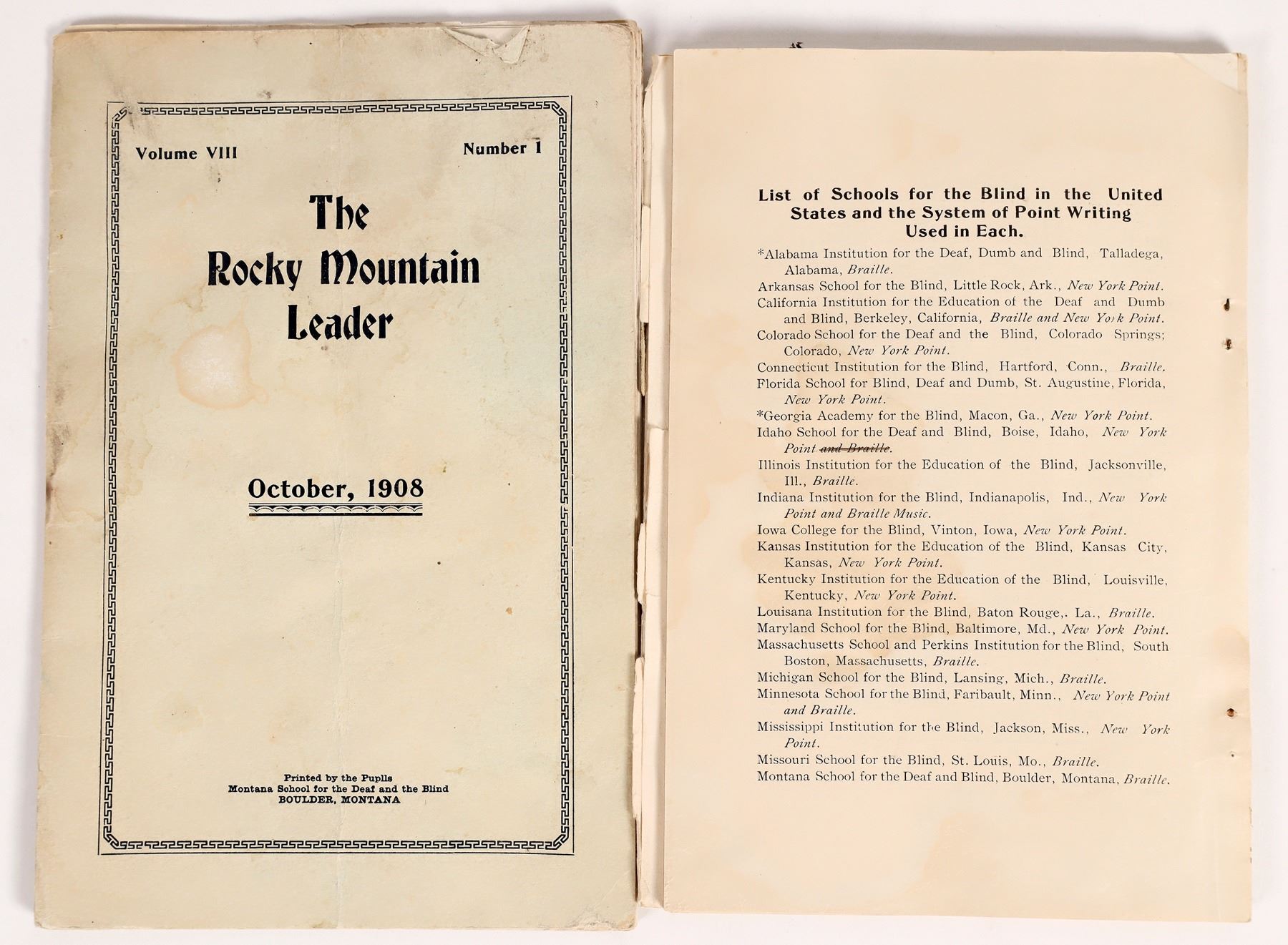 2 c. 1908 Montana School for the Deaf & Blind publications. The Rocky Mountain Leader, 14pp with detached cover, crease & stains. Thirteenth Annual Report, 1 cover detached, the other missing, 37pp with stains. [ Montana