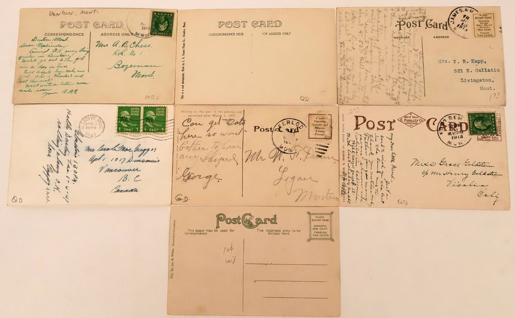 Nice grouping of seven postcards from small towns that begin with "D" through "G" in Montana. Includes Denton, Deer Lodge, Flathead Valley, Fort Benton, and Glendive. Nice mixture of color and black and white postcards. Great little three piece collection of Glendive postcards that feature the Jordan Hotel and Annex, N.P. Depot, and Dawson Co. High School. Featured on the Denton, MT postcard is The Big Store M.C. Oster Prop.with an early auto parked in dirt street out front. It is postmarked 1914.