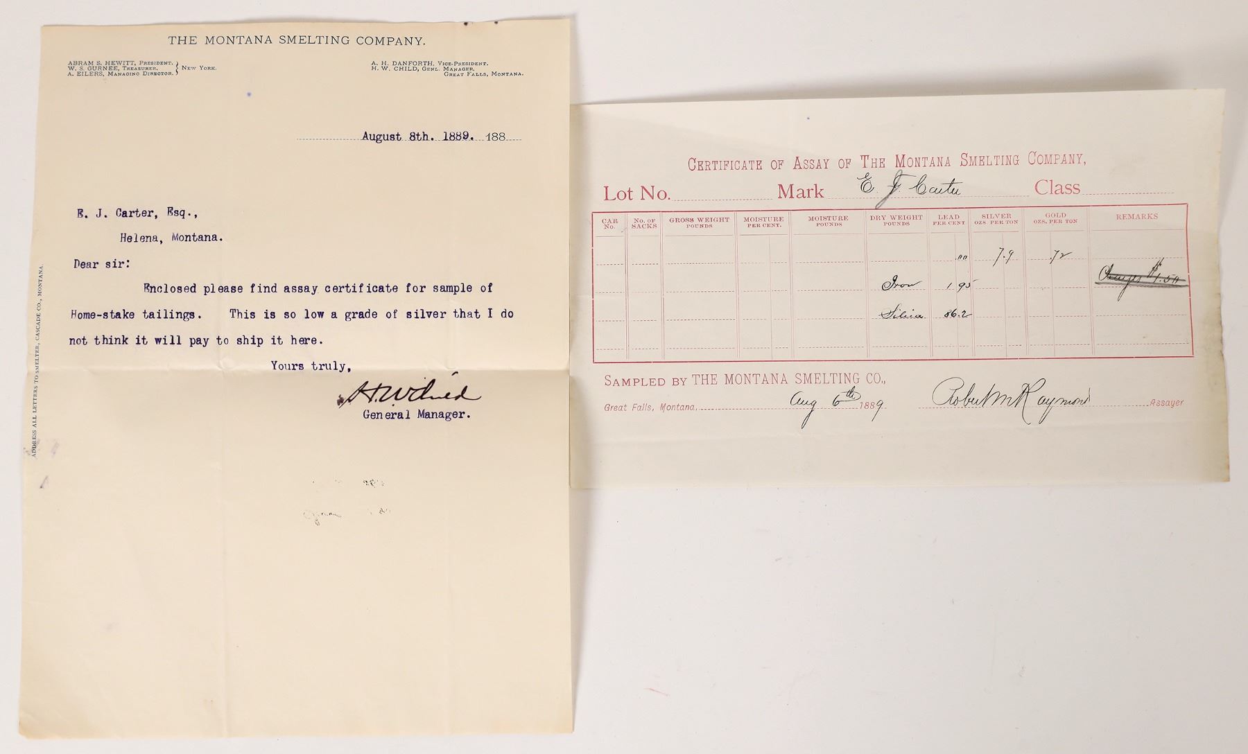 1889 Montana Smelting letter and assay report on Home Stake tailings with finding of a low grade of silver. Montana