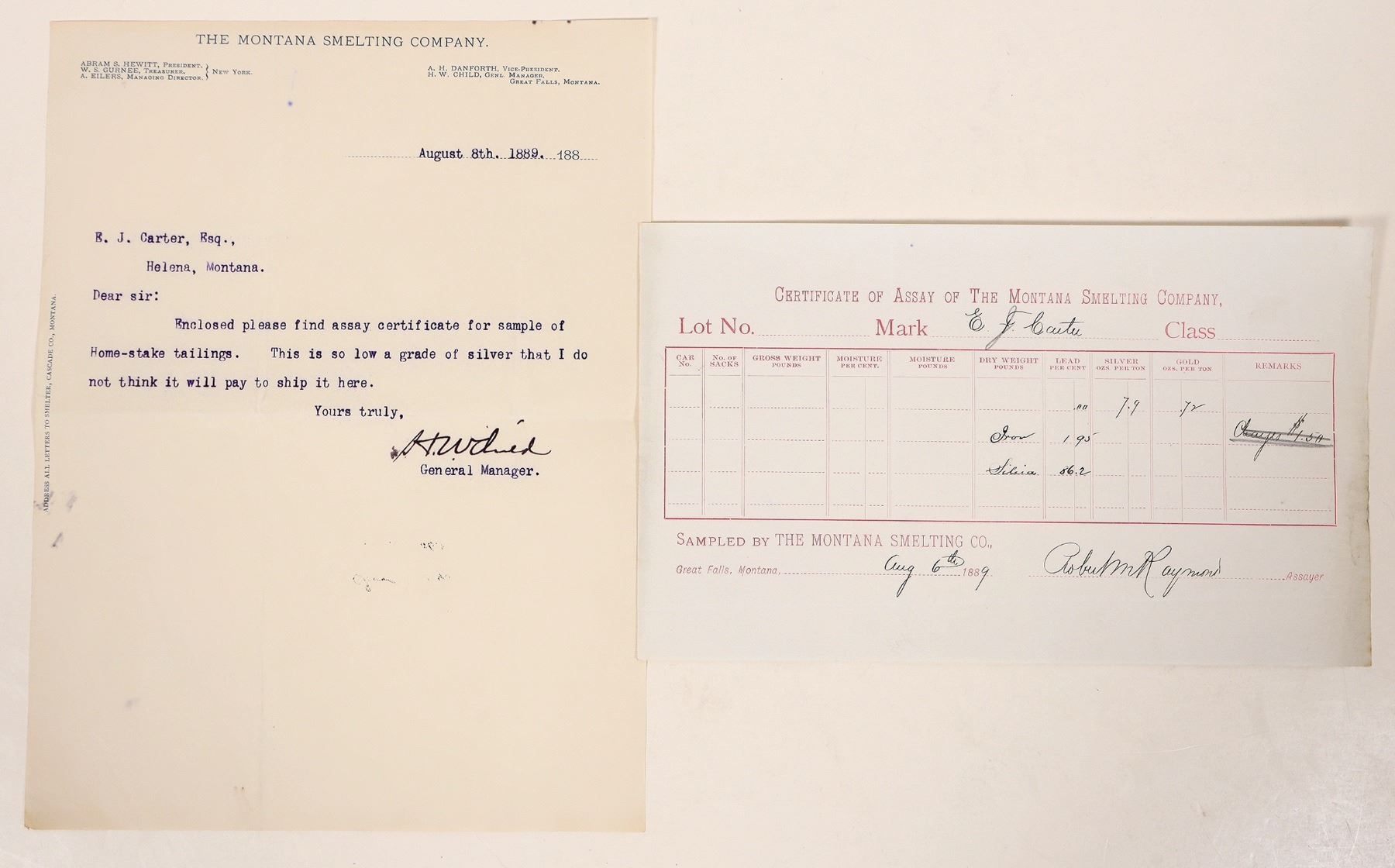 August 6th, 1889 Certificate of Assay of The Montana Smelting Company for E. J. Carter, Esquire of Helena Montana, signed by Robert M. Raymond assayer. A typewritten letter dated August 8th, 1889 to Mr. Carter stating "This is so low a grade of silver that I do not think it will pay to ship it here." Signed by the General Manager. Not all mining in the Old West was successful.