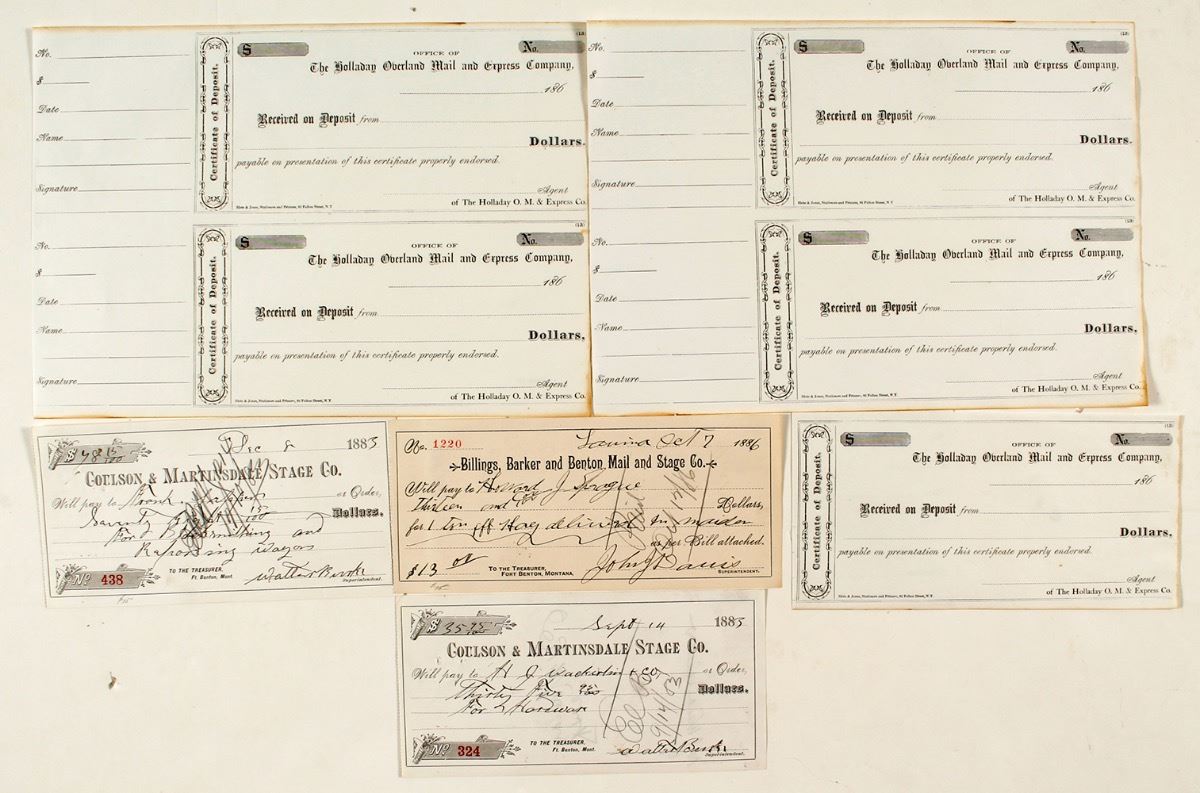 Lot of 6. 1) Two drafts from Coulson & Martinsdale Stage Company. Both issued 1883. For blacksmithing and repairing wagon. Clean. 2) Billings, Barker and Benton Mail and Stage Company draft dateline Lavina, Oct. 7 ,1886. For hay shipment. 3) Five unused Certificates of Deposit for The Holladay Overland Mail & Express Company (c.1860s). Two sheets of two and one single. Light toning on edges. City: State: Montana Date: 1860s-1886 ID: 36663