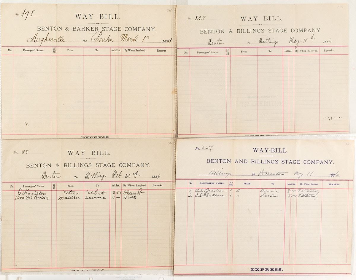 Lot of four. Two different stage companies. 1) Three Way Bills for Benton & Billings Stage Company, all dated 1886 for travel between Benton and Billings. 16" x 10.5" 2) One Way Bill for Benton & Barker Stage Company dated 1883 for travel between Hughesville and Benton. 16" x 10.5" (Prag Collection) City: State: Montana Date: 1883-1886 HWAC# 34117