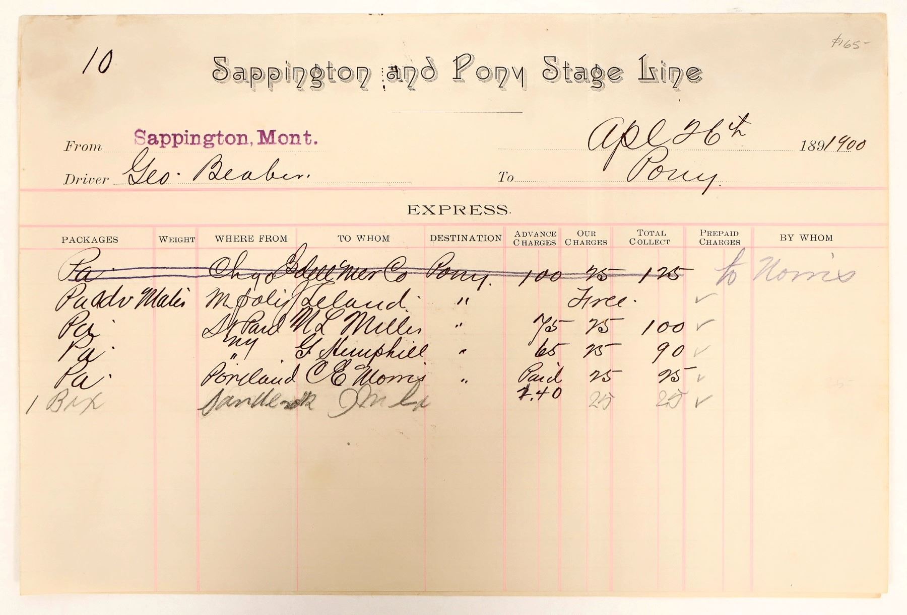 A ledger from the Sappington and Pony Stage Line of Sappington, Montana, dated April 26th, 1900. The ledger records the transport of packages through the company. The document is printed and filled in by hand with details such as the package's origin, recipient, and price. It is in good condition, with minimal toning consistent with age.
