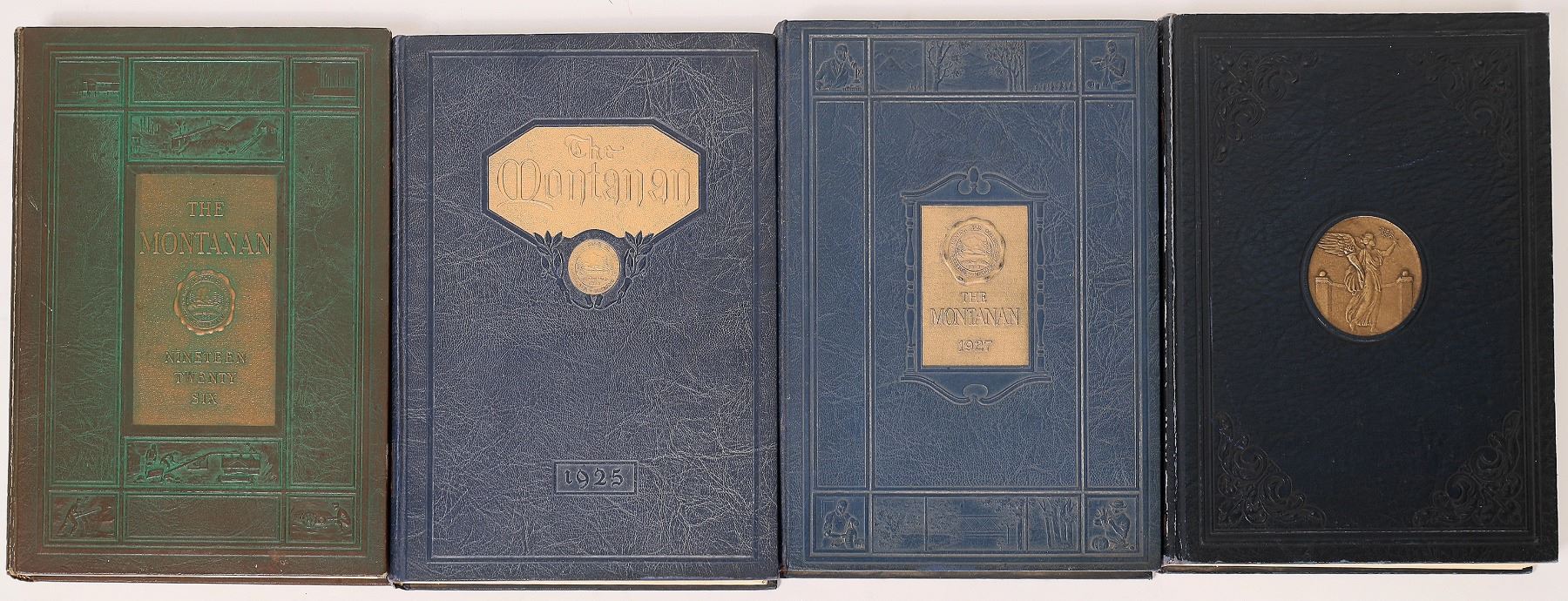 Four volumes of the The Montanan, the yearbook of the Montana State College in Bozeman. These are four consecutive volumes published in 1925, 1926, 1927, and 1928. They contain information about the college's classes, athletics, organizations, activities, etc. There are also photographs of administrators, students, athletes, club members, etc. There is also some very nice artwork and illustrations in these yearbooks. Each volume is 8 x 10.75, good condition. Montana Montana