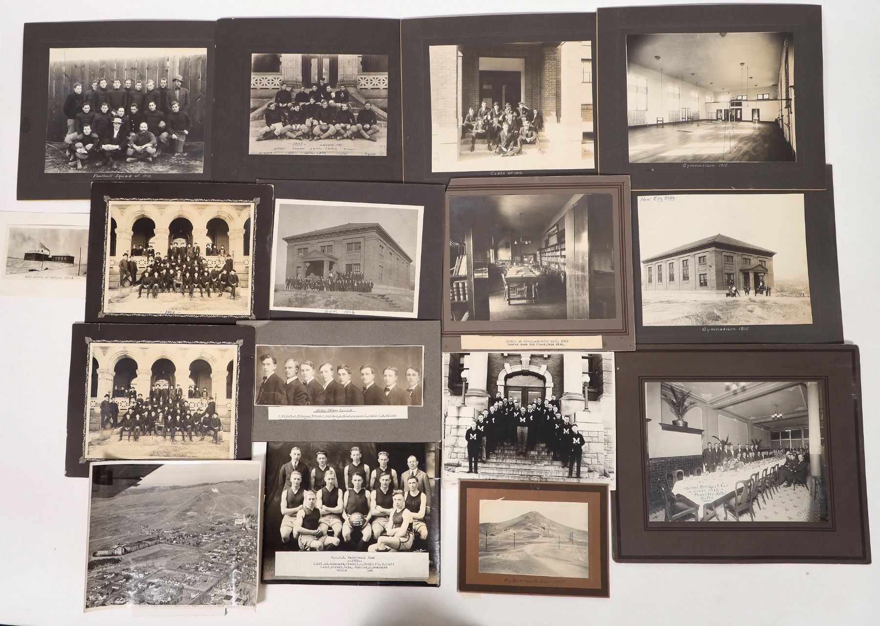 A group of 16 original photos from the archives of the Montana State School of Mines, dating 1905-1920. MSSM opened in 1895 and graduated its first class in 1903, meaning that the students in these photos were among the first to ever attend the school. Subjects of photos include the MSSM football and basketball teams, the school's gymnasium (interior and exterior), students, the 'Big Butte' mountain, the school's annual banquet, and more. 4 of the photos are labelled on the back with IDs. All photos are in good condition, most are mounted on stiff board.