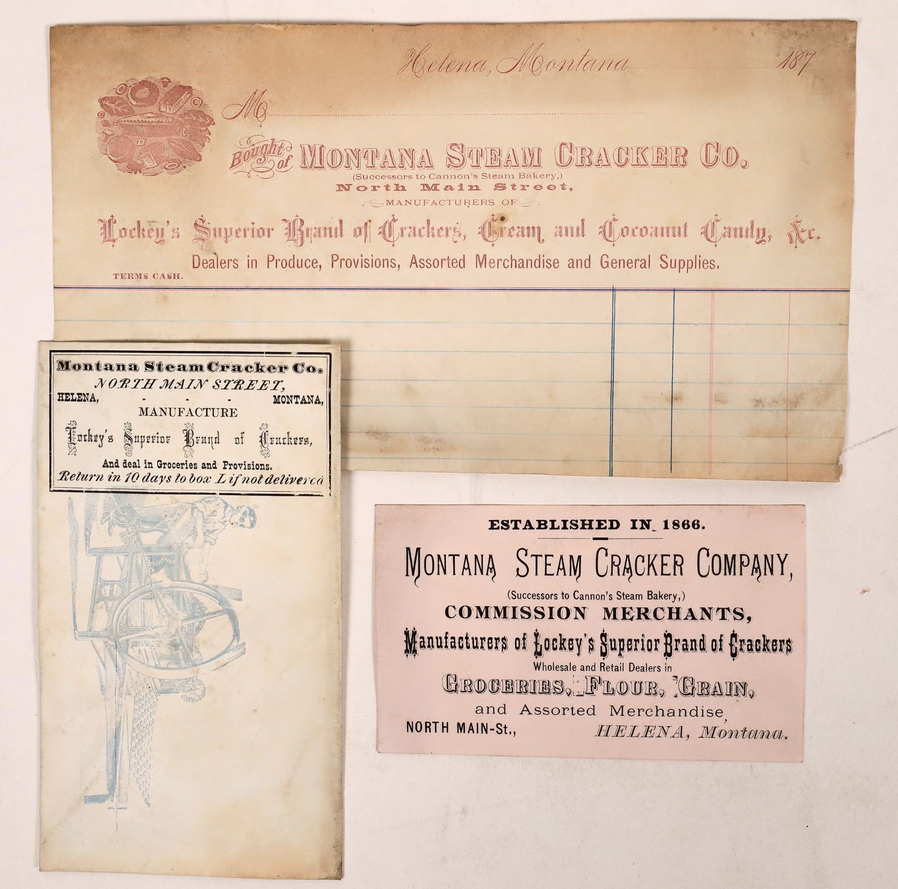 3 advertising pieces from Montana Steam Cracker in Helena. Pink business card, full face advertising cover with blue machine and worker-sealed and wrinkles, c. 1870's pictorial billhead with lower left chip.