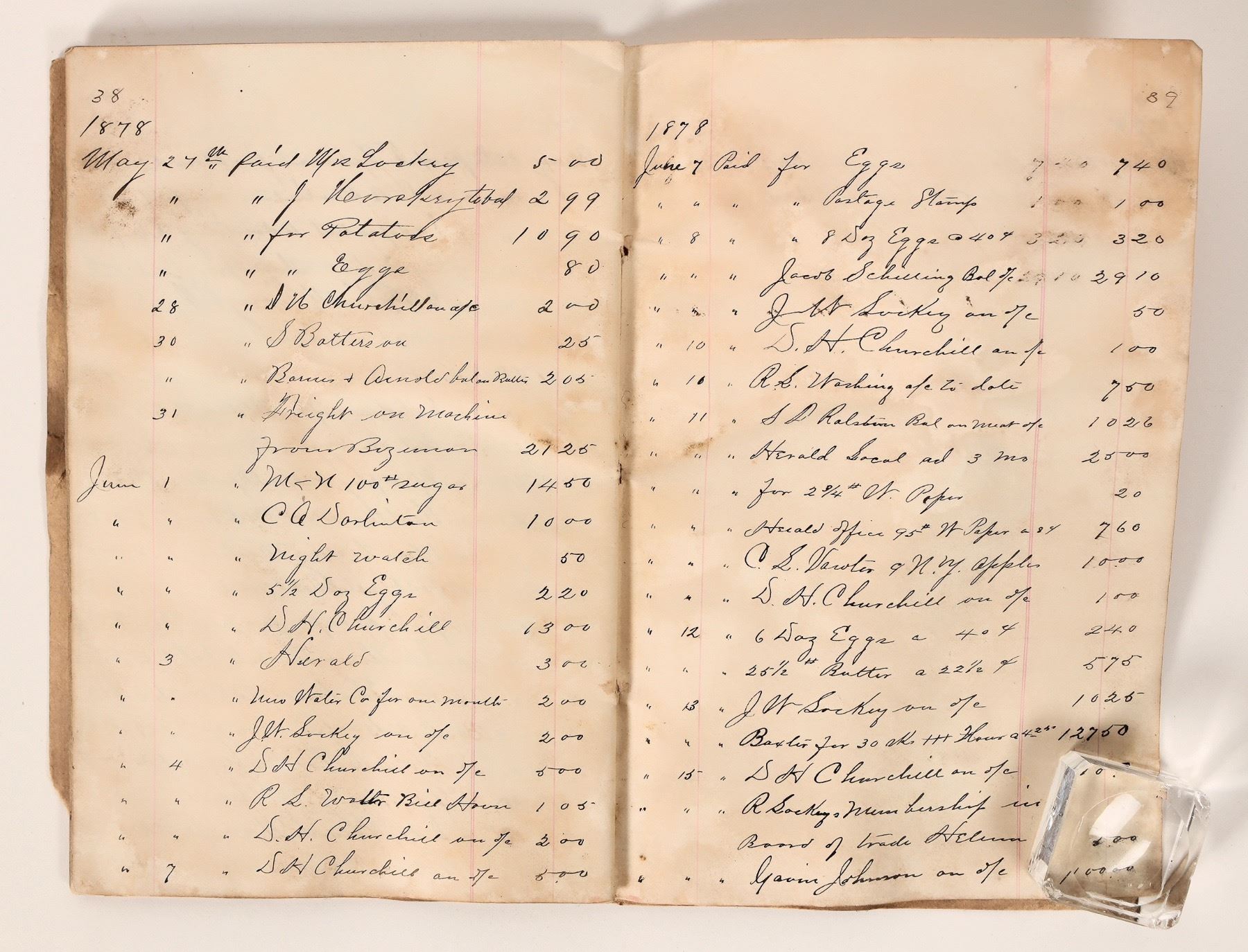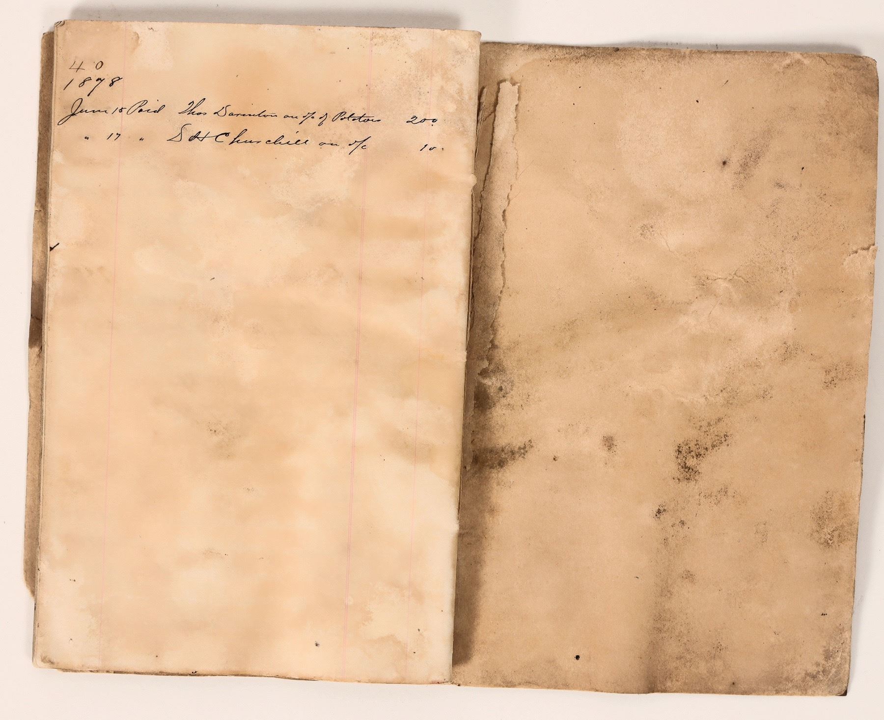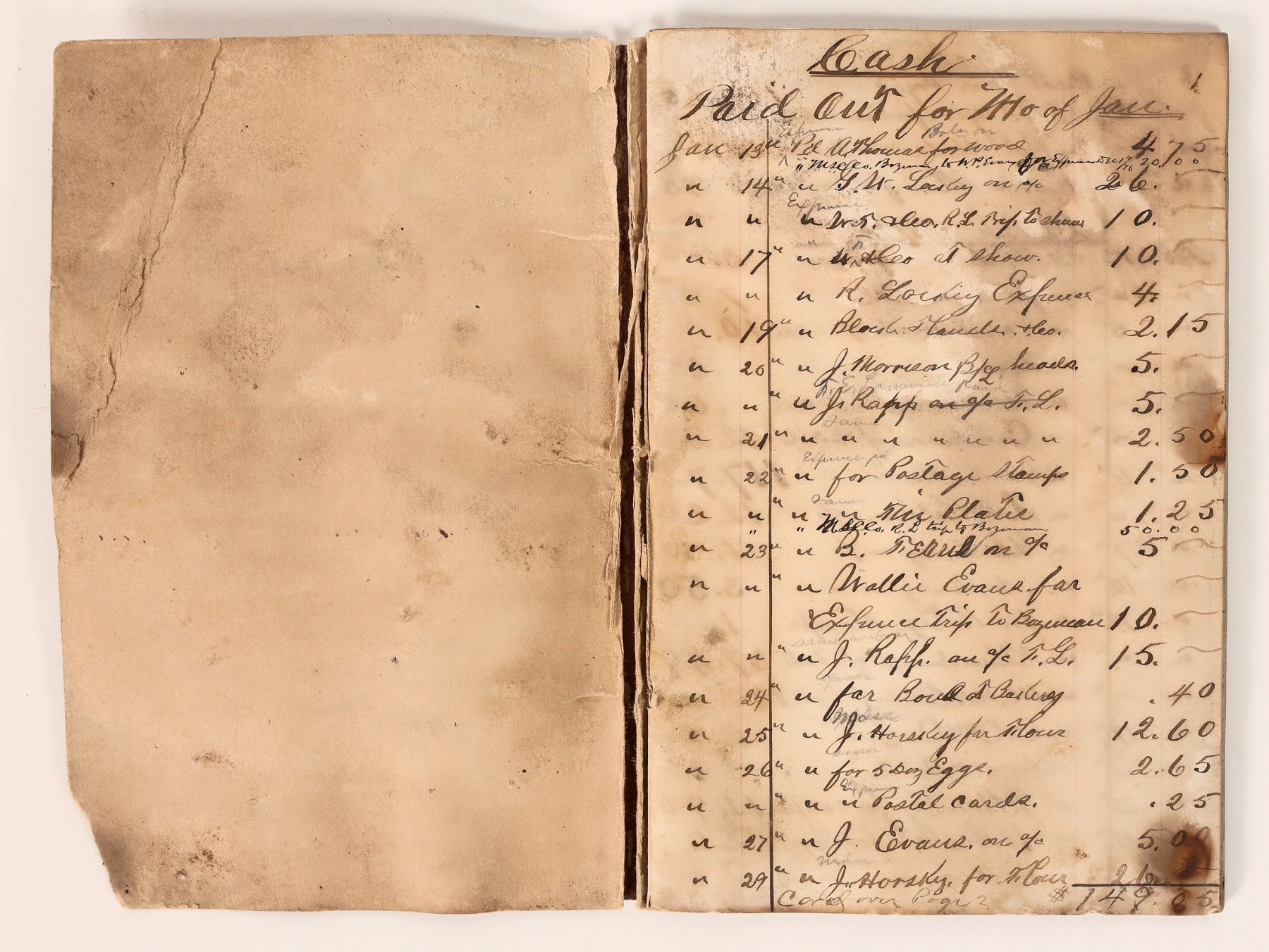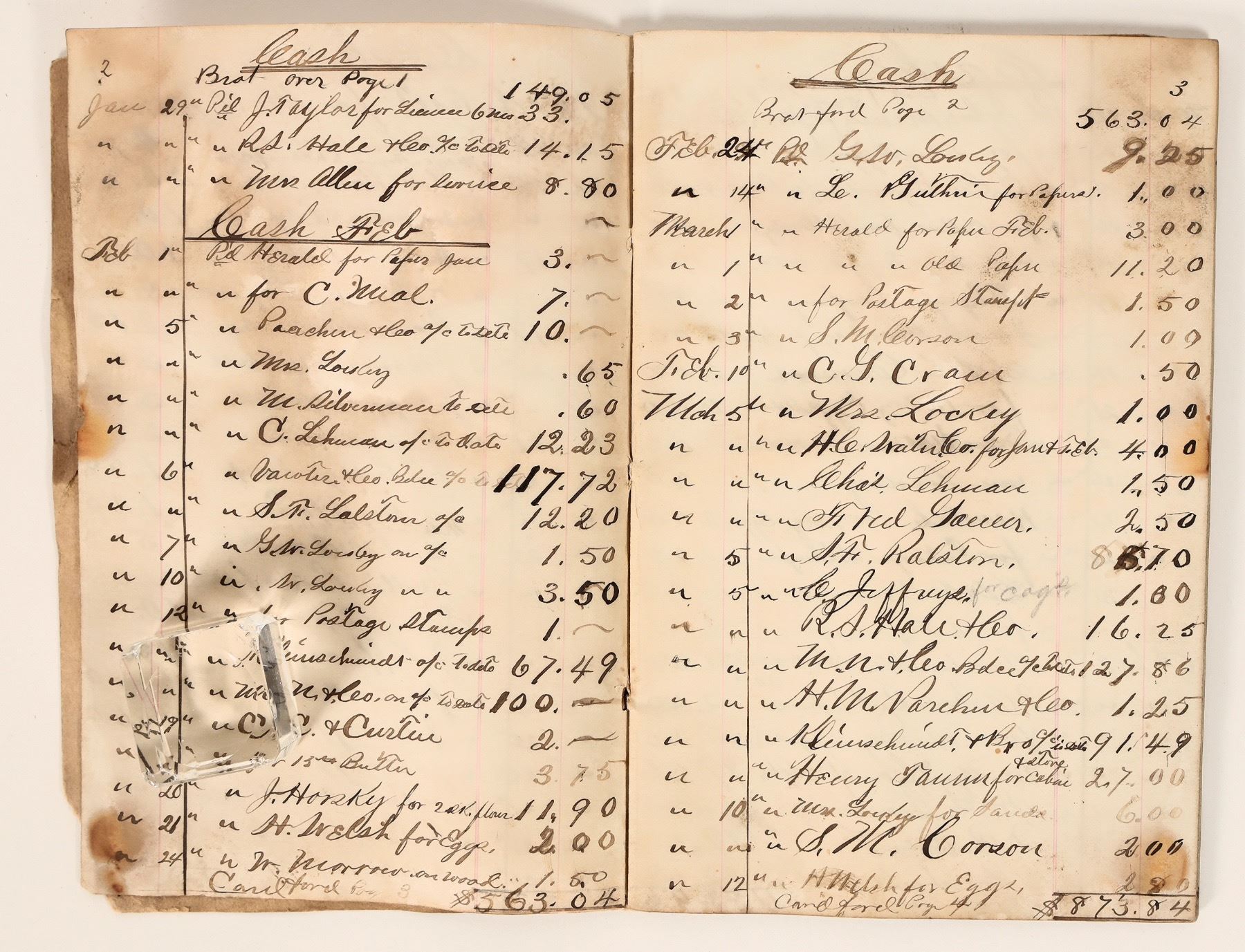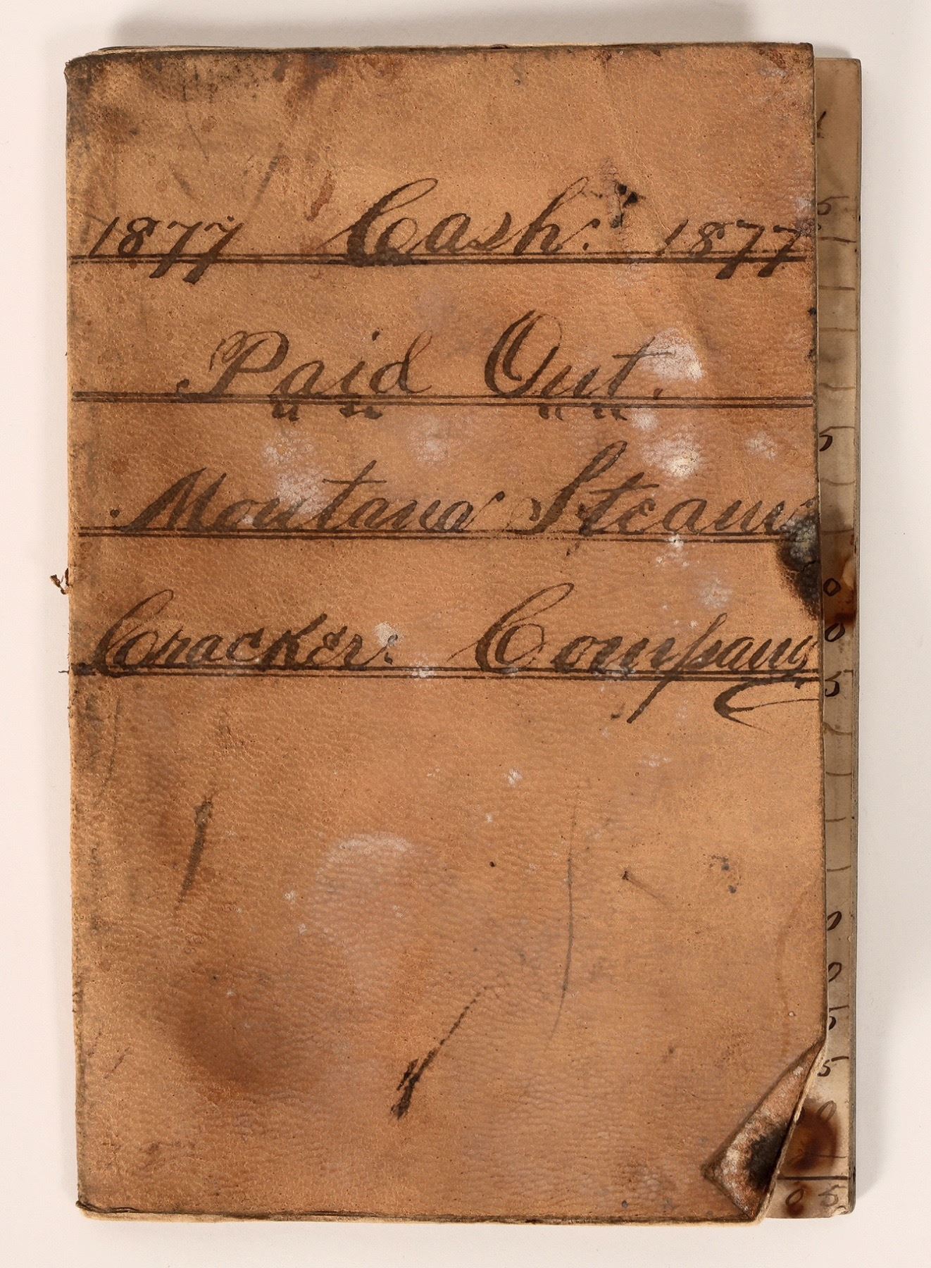 1877 Montana Steam Cracker cash book. Leather cover is detached, some staining.[ Montana