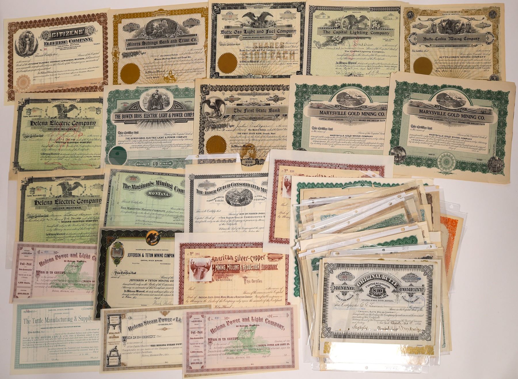 Montana Stock assortment with a few rarities. Alder Gulch Cons, Jefferson and Teton Mining, Maginnis Mining, Marysville Gold, Butte Corbin Mining, Miners Savings Bank, Fort Belknap Canal, Overland Cons Gold, Montana Chicago Mining, Basin Gold and Silver, Butte Tombstone, Silver Cliff Mining. Many more, some not mining. State:Montana City: Date: Provenance: Stuart Mackenzie Montana Ephemera Collection