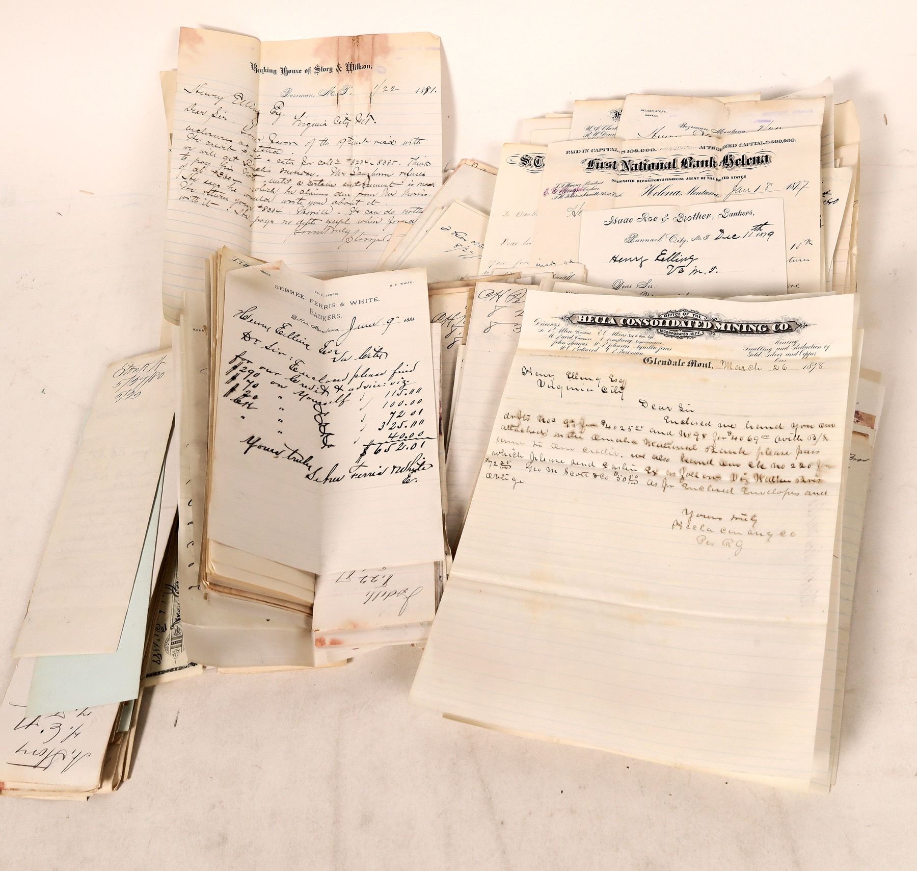 About 300 Montana bank letterheads, c. 1875-81. All are Territorial, most designed as such. Bannack, Glendale, Bozeman, Salisbury, Twin Bridges, Dillon, Helena, Egerton etc. 2 lbs! Montana c.1875-1881