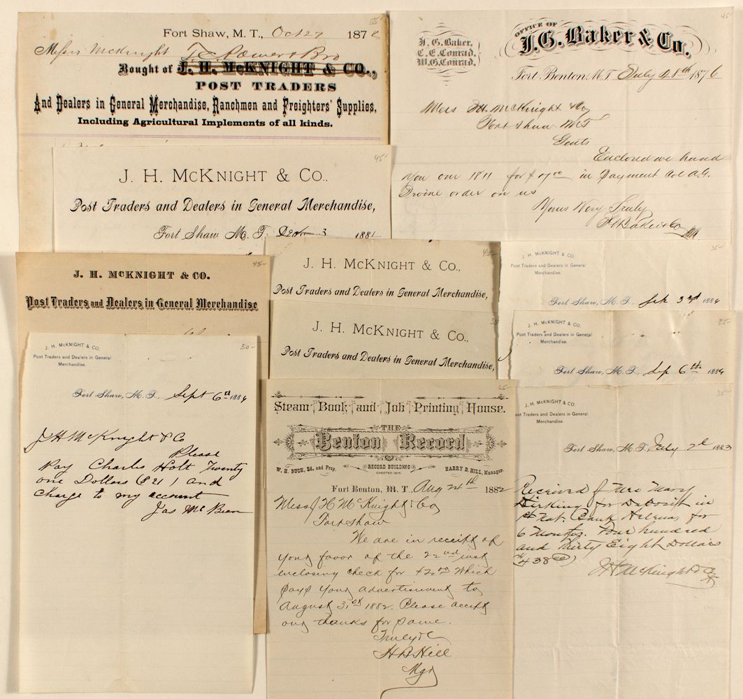 Seven small letterheads and two billheads for J.H. McKnight & Co., Post Traders and Dealers in General Merchandise in Fort Shaw, Montana Territory. Also included is a small letterhead for Benton Record and a larger letterhead for J.G. Baker & Co., both in Fort Benton and addressed to McKnight. All the documents in this group have M.T. designation. Prag Collection