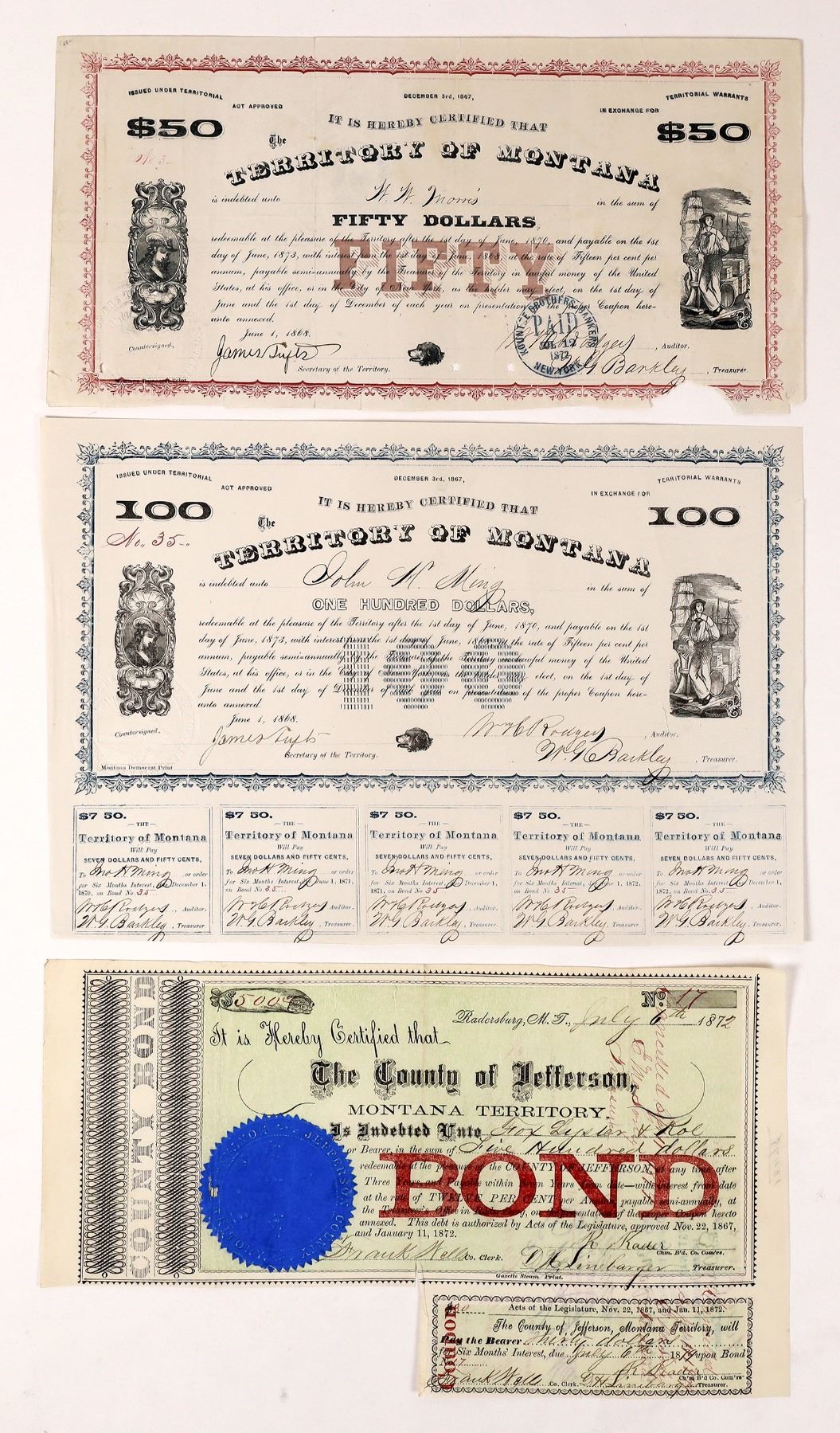 3 Montana Territory bonds from the personal collection of Stuart Mackenzie. 1872 County of Jefferson, red 1867 pictorial Territory of Montana-lower right chip and left side edge crease and small hole. Blue 1867 pictorial Territory of Montana with 4 coupons.