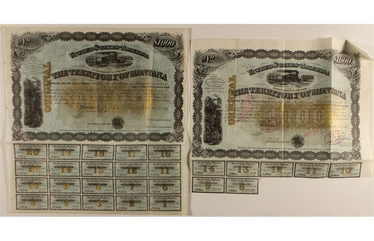 Lot of 2: these railroad bonds feature 20 revenue stamps for $35.00 each attached, as well as multiple vignettes. One is uncancelled and not executed with any signatures. The other has been signed and cancelled, with 7 of the 14 $50.00 revenue stamps removed. The lithos were done by the New Northwest Litho Agency. While displaying some age wear, both these 15.5" square bonds are in very good to excellent condition. Rare.City: County: State: MTDate: c1880