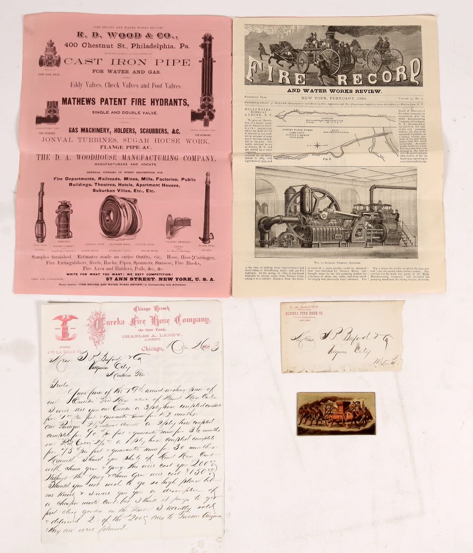 Fire Record and Water Works Review, February 1886 issue. Published by Fred Miller of New York. Ten pages. 1883 hand written letter from the Eureka Fire Hose Company of New York to S. R. Buford & Co. of Virginia City, Montana Territory concerning the purchase of fire fighting materials. A color drawing of six firemen rushing a hand pump wagon to a fire (2 x 4 inches). Montana c. 1880-83