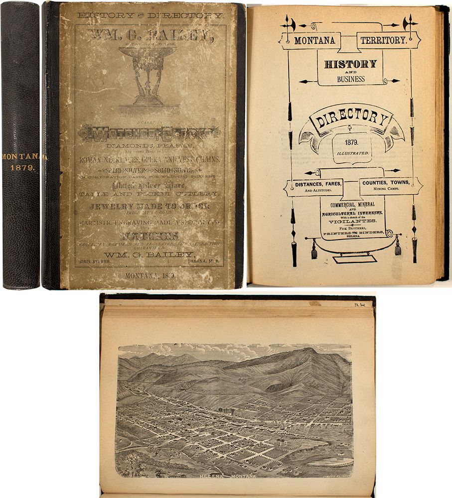 "Distances, Fares, and Altitudes. Counties, Towns, Mining Camps. Commercial, Mineral, and Agricultural Interests with a Sketch of Vigilantes." Fisk Brothers, Printers and Binders. Helena. 1879. 218 pages. Table of contents listing categories and cities. Nice illustrations, including of "Gate of the Mountains" and of Helena. Directory section goes county by county. Condition: Original boards laid down on black library spine. Pages have some toning. Denver Public library stamp on back of title page. Pencil notations on table of contents: "Presented William Rogers, Esq. with the compliments of Robt. C. Walker. Helena, MT, Sept 27, 1880" A second owner's name on inside back cover: "John Kastad, Basin Mont. 5/15/27" Map and front litho missing, but photocopy version included. Rarity: [v], Howes "b"City: County: State: MTDate: