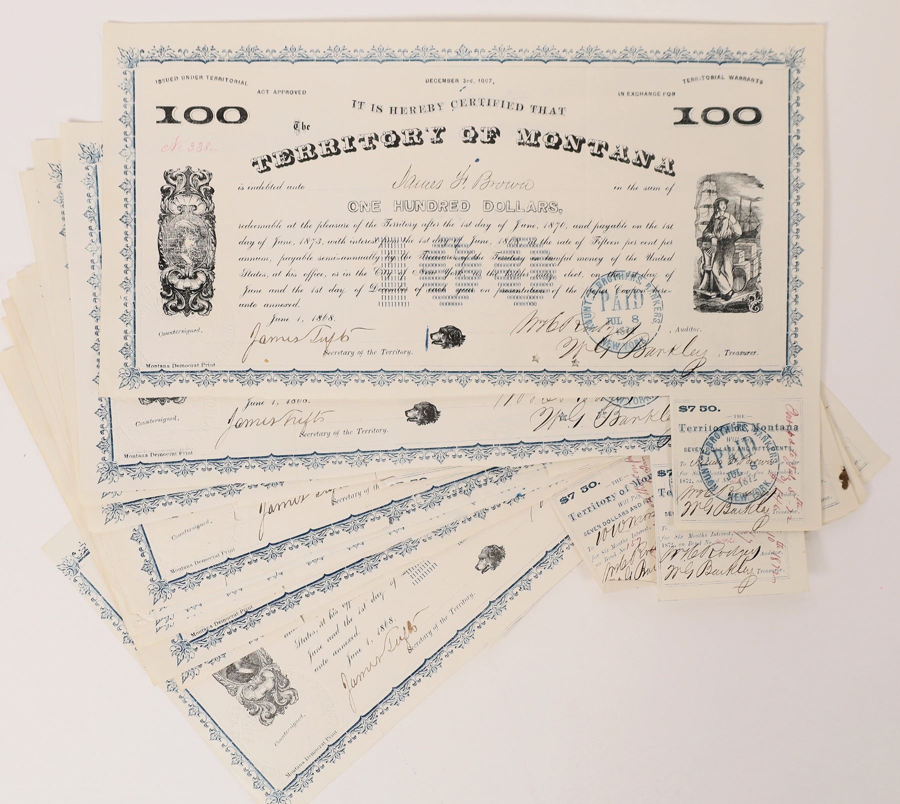 12 Montana Territory warrants c. 1868. Nice pieces for a research group as these bonds were issued to different people including a member of the A Clark family, all investors in Montana Territory future! 1 coupon present.