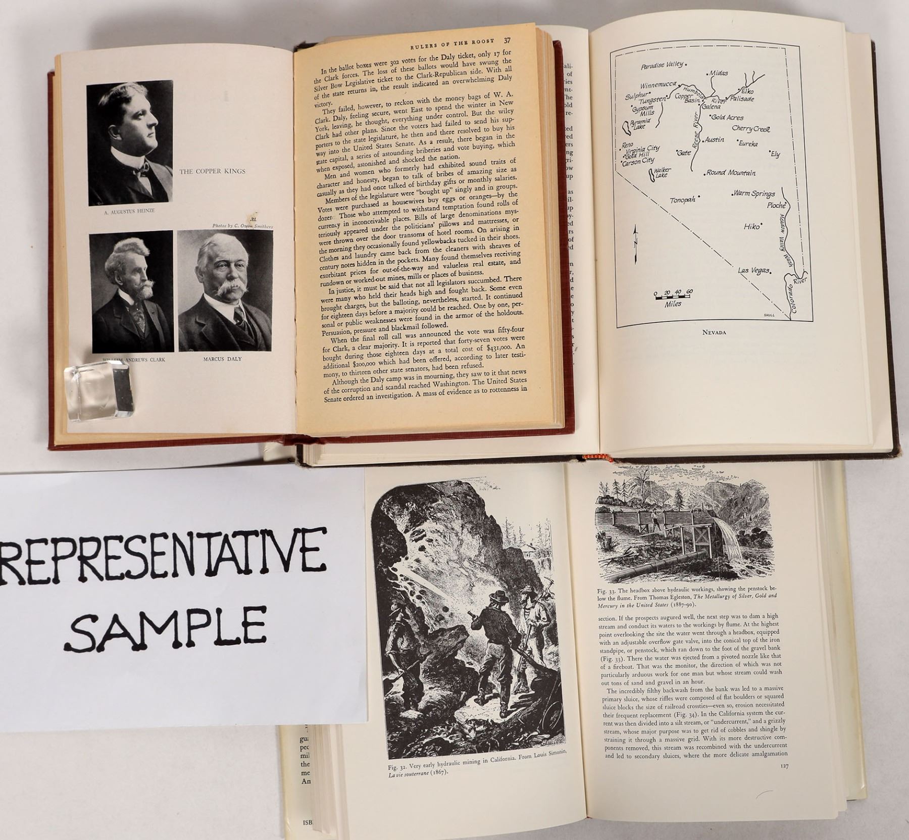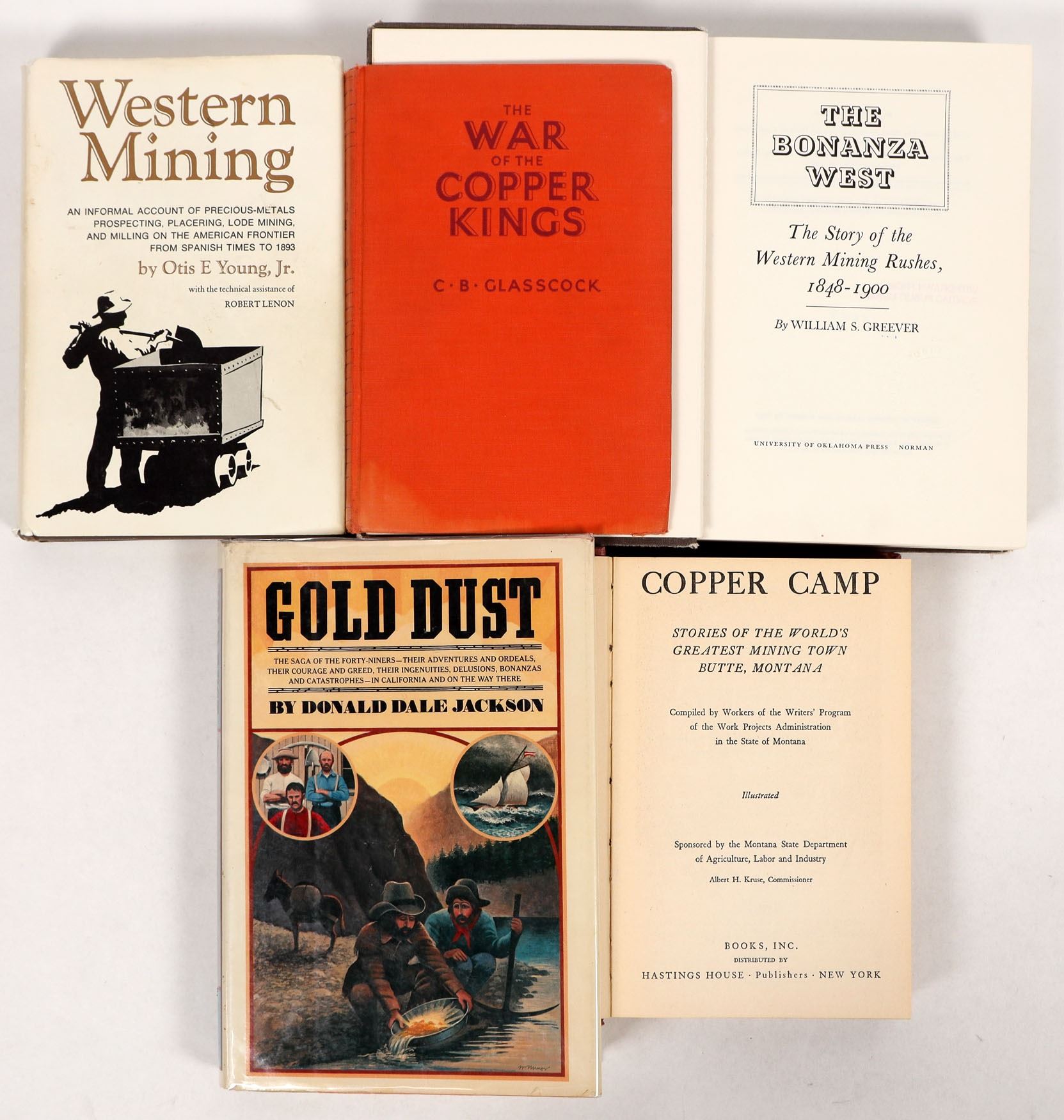 A group of 5 books on the mining history of Montana and the American West, dating from 1935 to 1980. Titles include 'Western Mining' by Otis Young Jr.; 'Copper Camp' compiled by the Montana WPA; 'The War of the Copper Kings' by C.B. Glasscock; 'The Bonanza West' by William Greever; and 'Gold Dust' by Donald Dale Jackson. The older books have some wear of the spine; otherwise, the lot is in good condition.