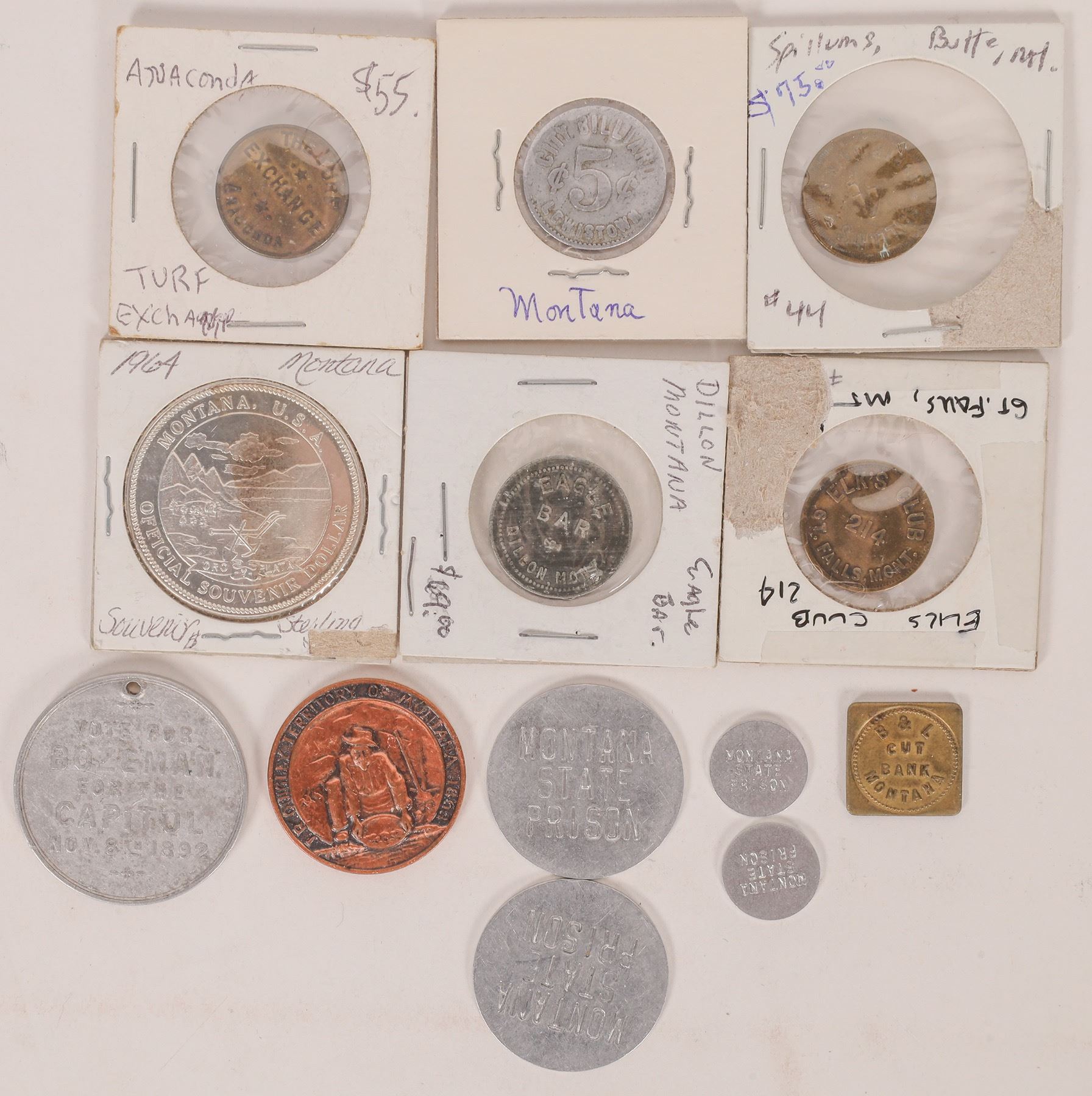 Lot of 45 Montana tokens. Virginia City, Anaconda, Cut Bank, Dillon, Miles City, Great Falls, Lavina, Harlem, Butte, Bozeman. Montana State Prison tokens. Montana