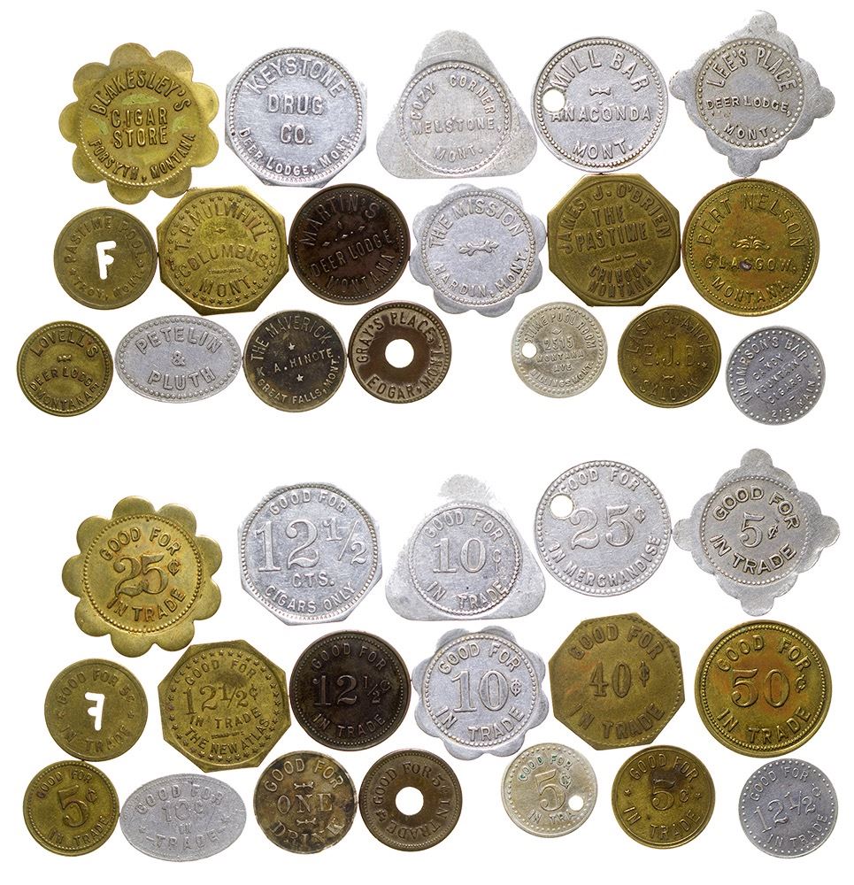 Lot of eighteen. One R-7 and four R-4. 1) R-7. Gray's Plcae, Edgar, Montana. 2) R-6. Pastime Pool, Troy. Cut 'F'. 3) R-6 Keystone Drug, Deer Lodge, Large Aluminum Octagon. 4) R-6. The Maverick. Great Falls. 5) Lancaster Saloon, Billings. Also Rounded triangle Cozy Corner, Melstone; scalloped Cigar Store, Forsyth; octagon TP Mulvihill, Columbus; scalloped The Mission, Hardin; punched hole Mill Bar, Anaconda; large Bert Nelson, Glasgow; oval Petelina & Pluth, Anaconda; Martin's, Deer Lodge; punched hoe Pastime Pool Room, Billings; large octagon James J O'Brian, Chipook; Lovell's, Deer Lodge; and Thompson Bar, Anaconda.