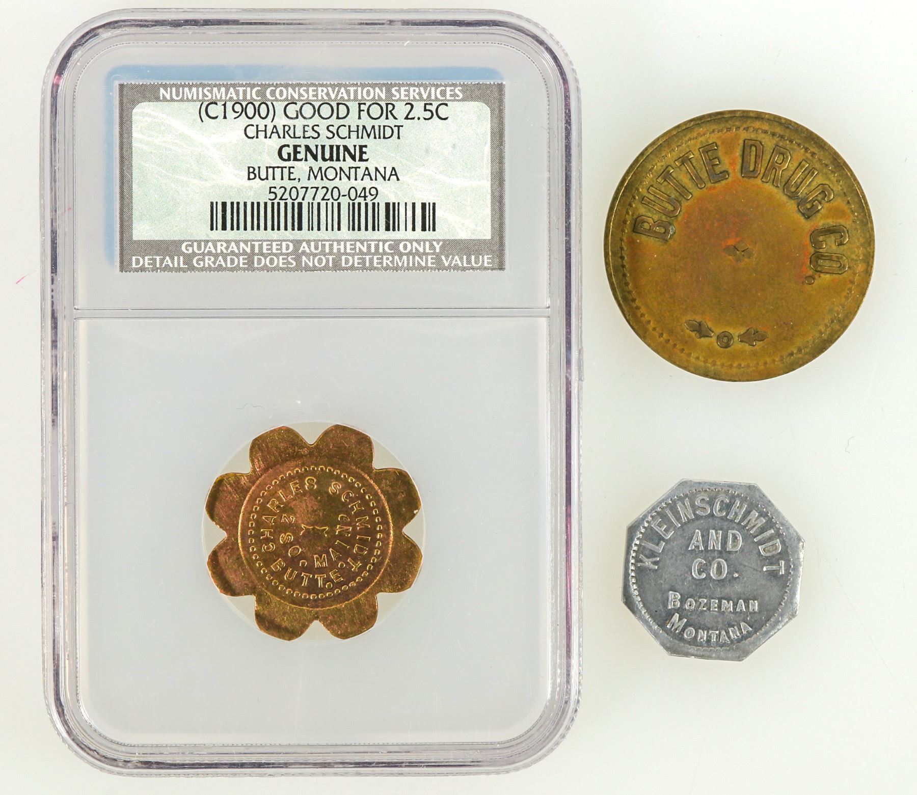 Three Montana tokens: 1) KLEINSCHMIDT / AND / CO. / BOZEMAN / MONTANA // GOOD FOR / 12¬Ωc / IN TRADE; Al., octagonal, 20 mm. 2) NCS Genuine: CHARLES SCHMIDT. / 2 SO. MAIN / BUTTE. // GOOD FOR / 2¬Ωc / IN TRADE; Br., Sc 8, 28 mm. 3) BUTTE DRUG CO. // GOOD FOR / 50c / IN MERCHANDISE; br., rd., 31 mm.