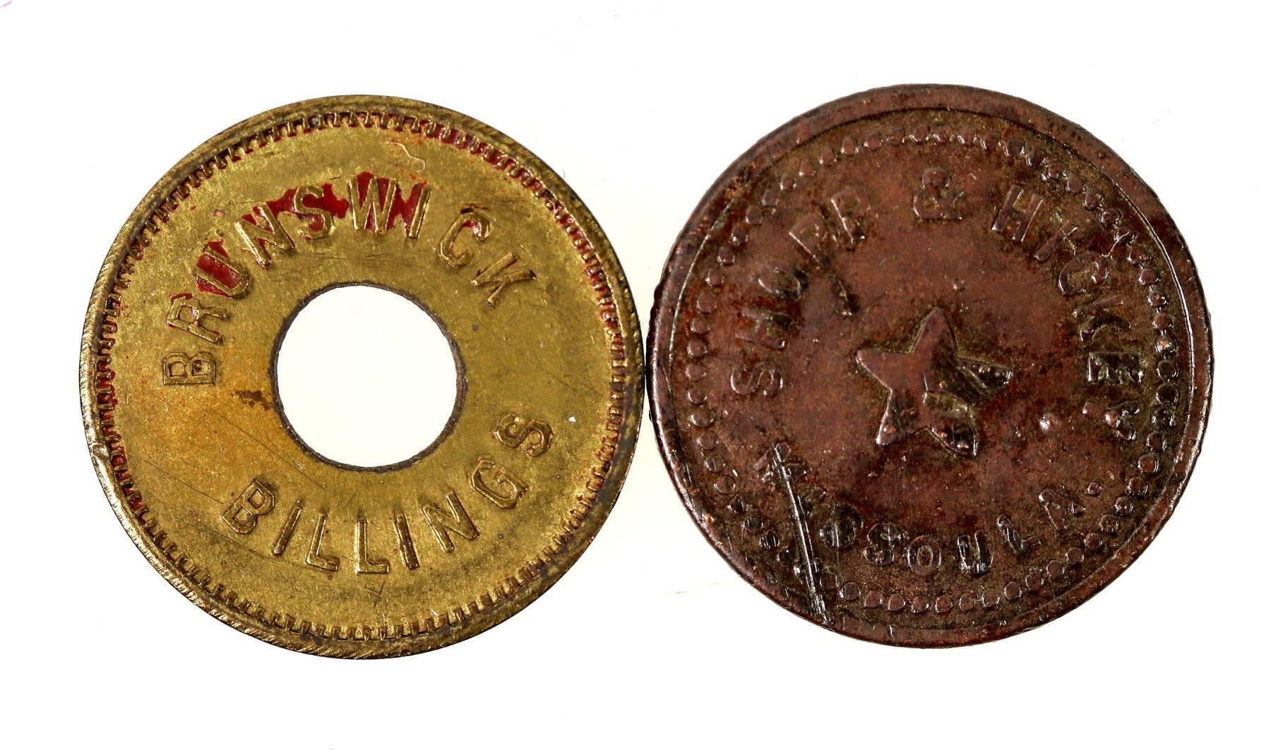 Lot of 2 different. 1) Brunswick / (hole cutout) / Billings // GF 5c IT. Round, brass, 21mm. 2) Shopp & Hickey / (star) / Missoula // GF One Drink. Brass, round, 21mm.