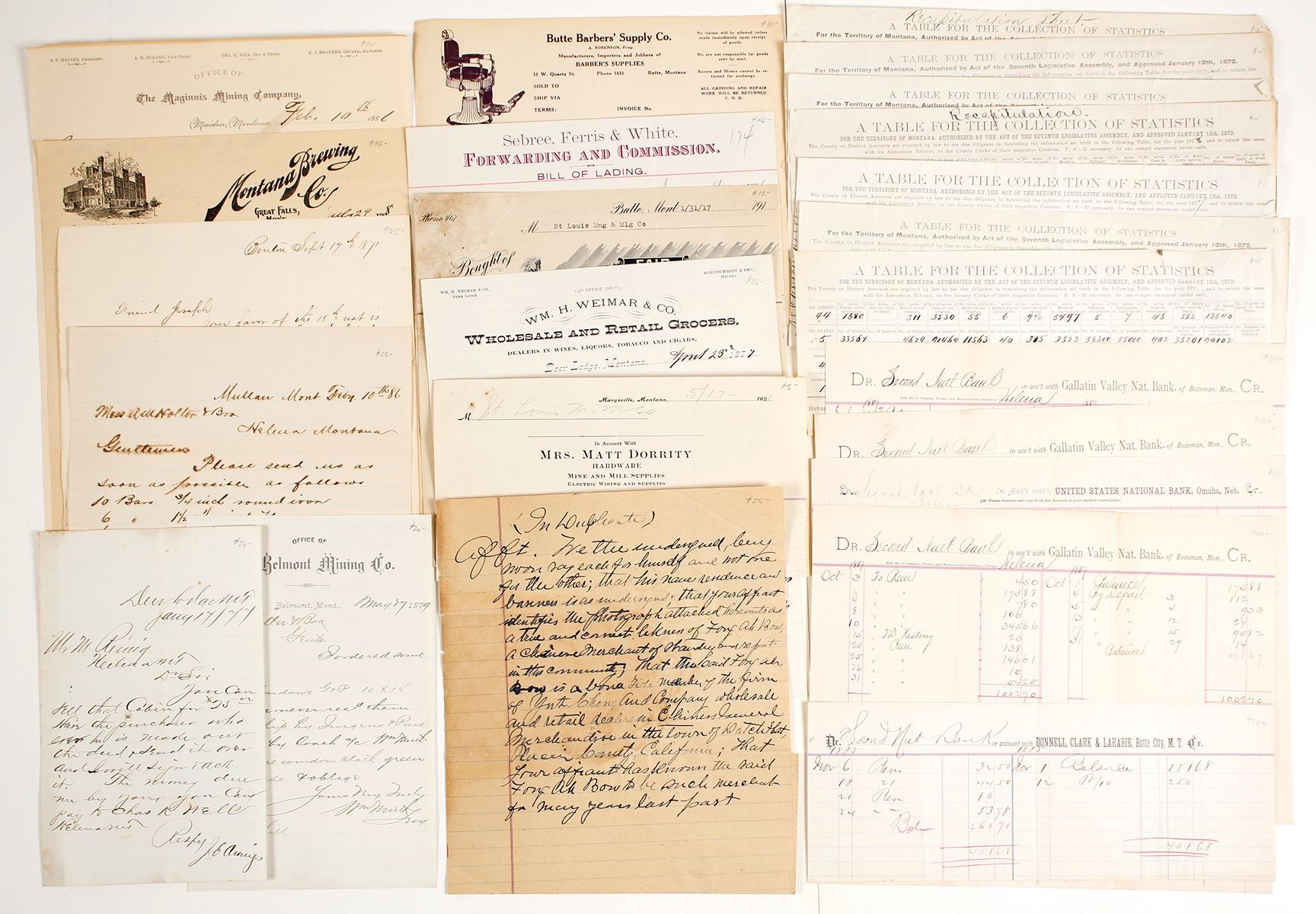 Approx. 20 pieces of ephemera including Bills of Lading, from Sebree, Ferris & White; Fair Drug and Assay Supply Co., Inc.; Letter from The Maginnis Mining Company, just to name a few. Date: 1870's Location: Montana HWAC# 64373