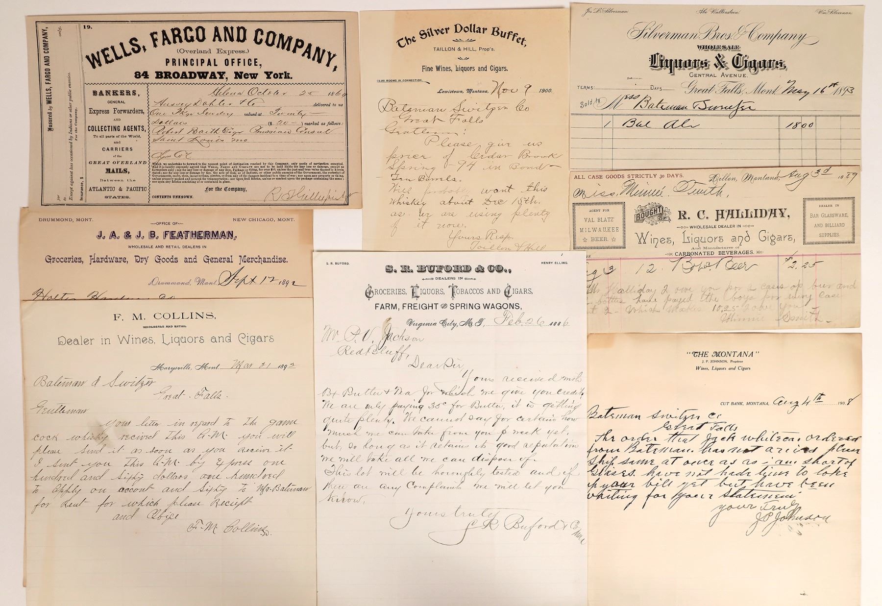 Assorted Montana ephemera. 3 liquor and cigar billheads 1889-1900. 1869 Wells Fargo & Co. $20 receipt for jewelry. 4 letterheads 1886-1908.