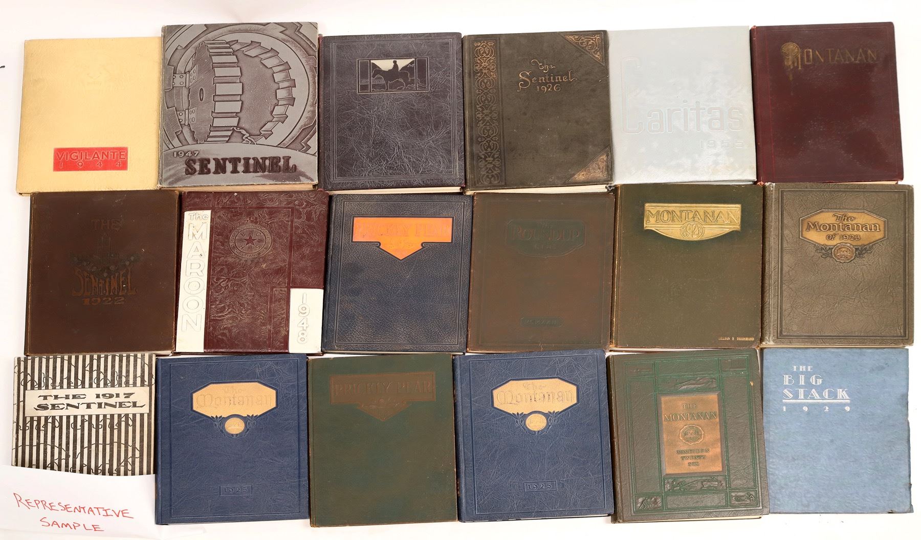 Approx. 45 Montana mostly college yearbooks. Sentinel 1906, Montanan 1919, Vigilante 1946, Sentinel 1925, Sunflower 1915 and many more. Check out those old hairstyles! Please inspect. City: State:Montana Date:1906-1950's