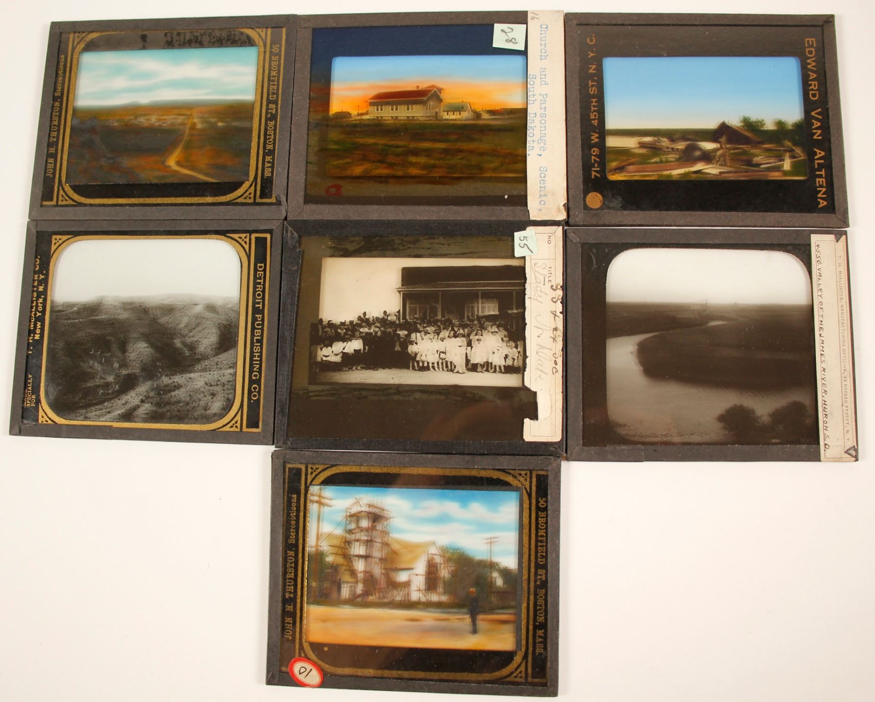 C. early 20th century glass slides. Sentinle Butte, a church, tornado damage Wessington Springs, Bad Lands, town gathering, valley of James River, Jamestown.