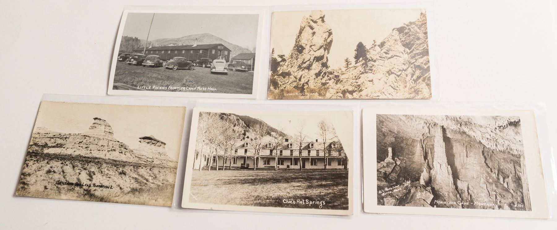 Five black and white real photo postcards. These RPC's include Morrison Cave, Chico Hot Springs, Little Rockies Frontier Camp, Sixteen Mile Canyon (1909), and a Bad Land Formation. Date: Location: Montana HWAC# 54035