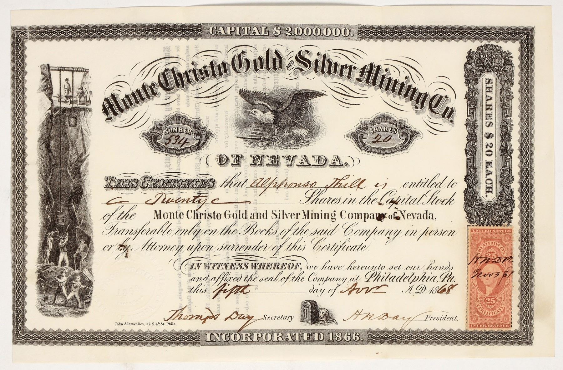 Cert. #534, issued for 20 shares to Alphonso Hill in 1868 and signed by H. N. Day as president and Thomas Day as secretary. White Pine Mining District. Located Lander County, soon to be White Pine County. Particularly crisp vignette of six miners working down in the shaft with two miners hauling up ore barrels. The certificate was issued at Philadelphia, PA., so this was an Eastern financed operation. John Alexander, Philadelphia, printer. Uncancelled. Advertisements issued in this period put this mine in Lander County. It was not until March 2, 1869 when White Pine County was created from Lander County. So at the time this certificate was issued, it was indeed in Lander County. This mine got off the ground quickly, hit a snag and the mine and mill was back on track in 1868. The mill in January worked 135 tons of ore which produced $97,500.