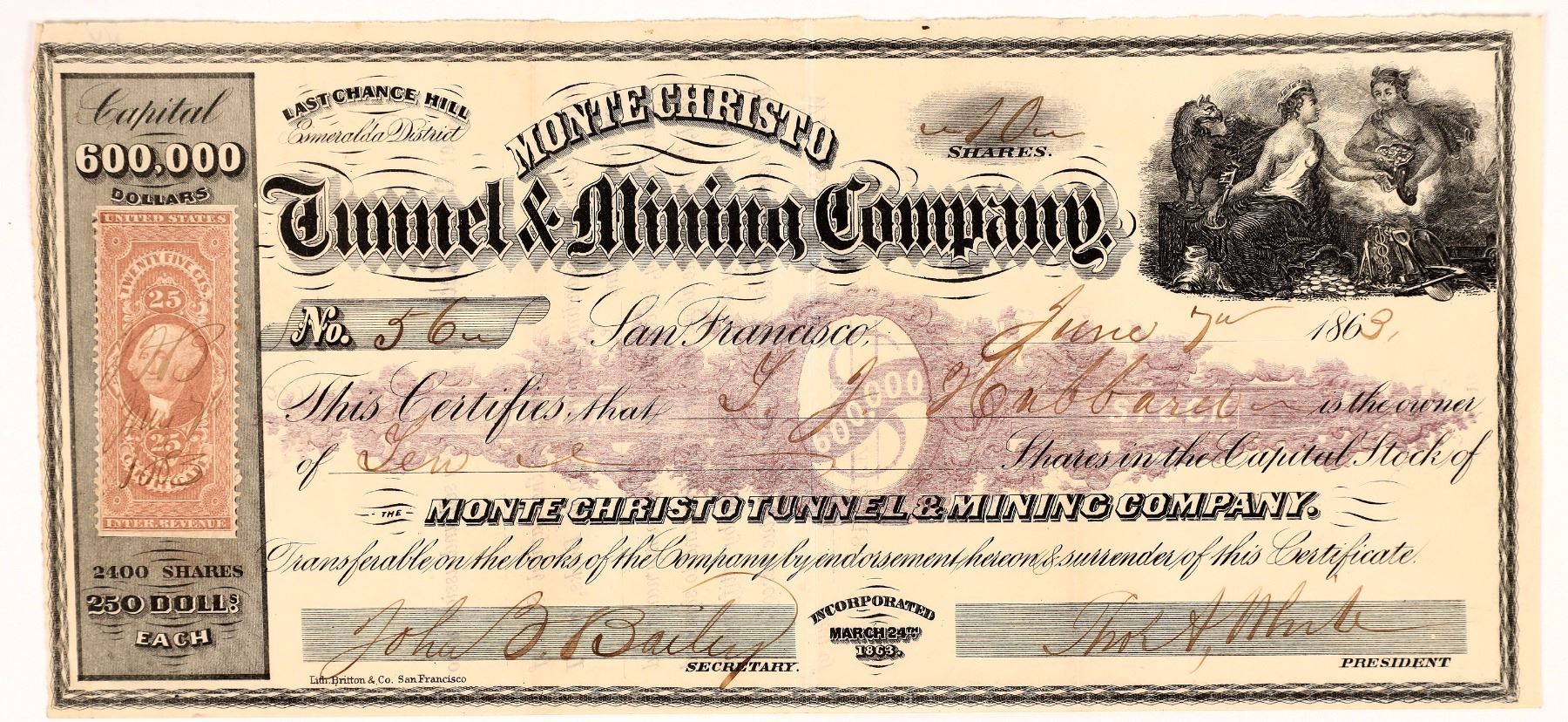Monte Christo Tunnel & Mining Company Stock Certificate 1863 [166937]