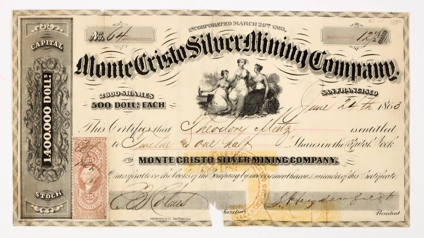 No. 64 Monte Cristo Silver Mining Co. Stock., Issued 1863. . Signed by S. Heyderfeldt, president. Vignette of three partially nude women at top center. Twenty-five cent adhesive revenue stamp. Printed by Britton & Co, San Francisco. Information about this company is very hard to find. Articles from June-July 1863 in the Daily Alta California mention stockholder meetings, an assessment being levied, and that their San Francisco office was located at No. 712 Montgomery Street. According to Bancroft's 1862 Washoe map (and Raymond 1870), the mine was located in the Flowery Mining District (Virginia City). Virginia City, NV. Between Flowery and the Mother Lode.