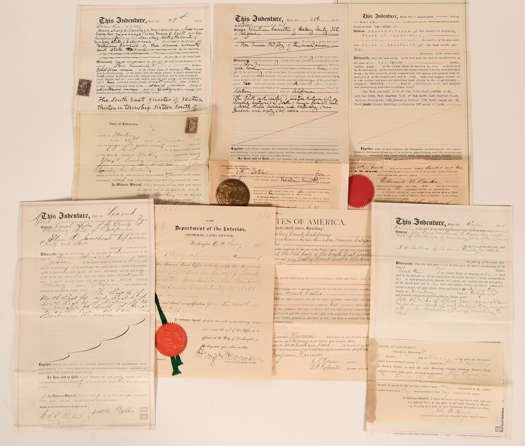 Lot of 6. 1) 1884, 160 acres in Monterey County. 2) 1897, lots in Salinas City. 3) 1899, 160 acres in Monterey County, with two documentary stamps. 4) 1902, 120 acres. 5) 1904, General Land Office documents granting Frank Castro 120 acres. 6) 1905, 160 acres. Includes background information on the people involved.