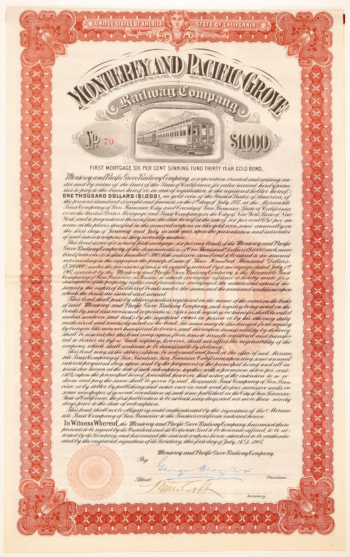 #79 of 300, I/U, $1000 6% 30 yr. First Mortgage Sinking Fund Gold bearer bond due 1937. Issued July 1, 1907, ROSE, embossed seal, vignette top electric trolley l-r name printed on side top, "1000" white outline over "$" white outline over brown burst underprint. Coupons #15-60 attached, Britton & Rey Co printer. Au cond. Ken Prag Collection