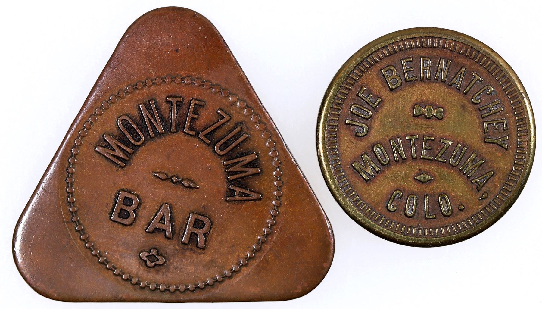 Two tokens from a rarely seen town: 1) JOE BERNATCHEY / MONTEZUMA, / COLO. // GOOD FOR / 12Ω¢ / IN TRADE; Br., rd., 21 mm. 2) Montezuma / Bar // Good For / 12 1/2c; Br., tri., 30 mm.