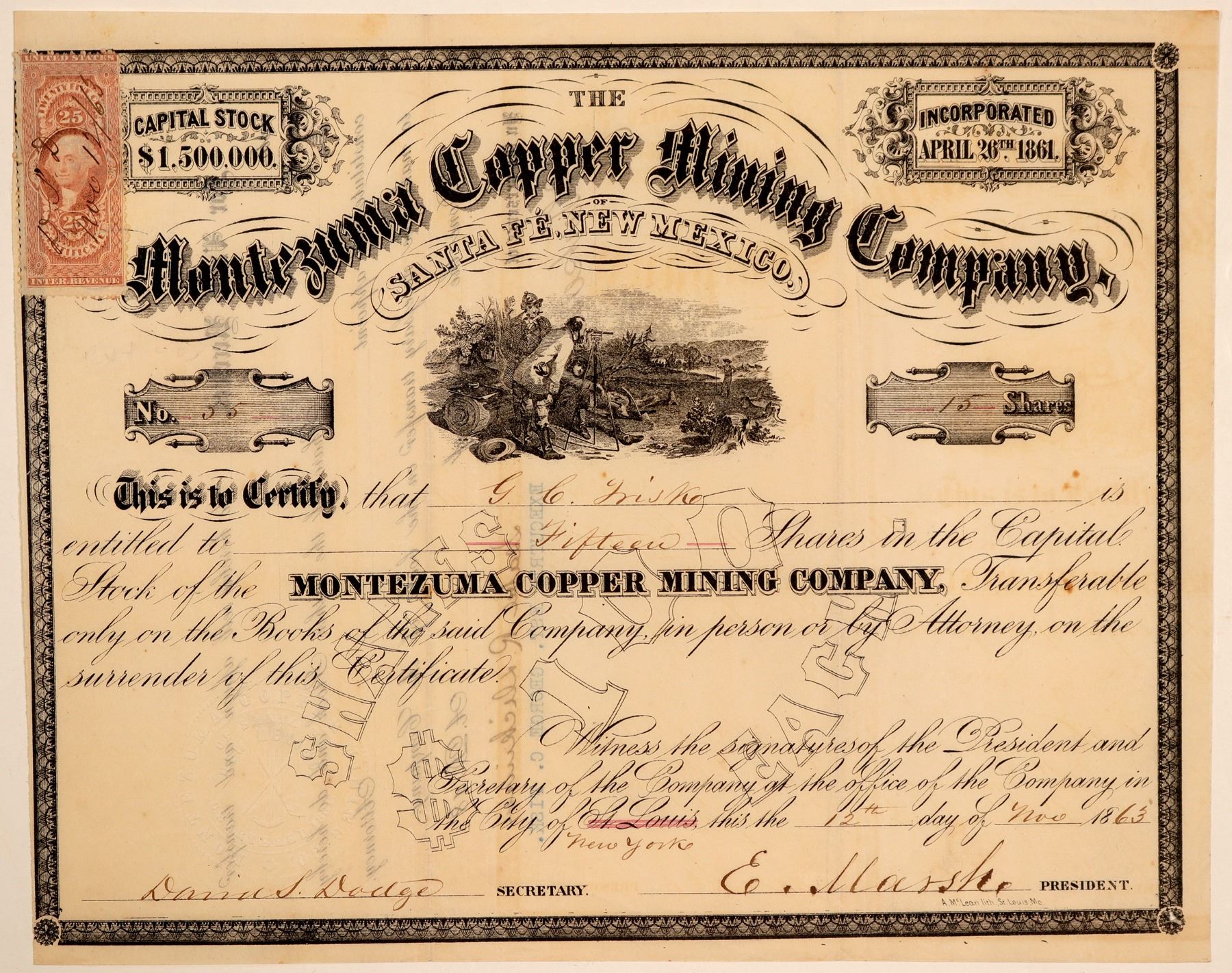 "of Santa Fe, New Mexico." No. 55, issued for 15 shares to G.C. Fisk on Nov. 12th, 1863. Signed by president E. Marsh and secretary Daniel Dodge. Not cancelled. Black border and print, vignette of Western explorers surveying the land. Printed by A. McLean Lith, St. Louis. 25 cent adhesive IR stamp attached at upper left. Pinholes, folds. 7.75 x 9.5" The Montezuma Copper Mining Company of Santa Fé, New Mexico was incorporated (1861) in the American Territory of New Mexico for the purpose of mining precious metals, industrial metals, and coal in the counties of Santa Ana, Santa Fé, San Miguel, and Rio Arriba. Corporate members were: Oliver P. Hovey, Anastacio Sandoval, Hamilton G. Fant, Tomás Cabeza de Baca, Ceran St. Vrain, Nicolas Pino, A. P. Wilbar, Francisco Lopez, S. J. Spiegelberg, José Manuel Gallegos, H. B. Sweeny, Mateo Sandoval, Joseph Seligman, Felipe Delgado, Levi Spiegelberg, Francisco Montoya, Richard Jenkins, José Guadalupe Gallegos, Edward Wise, Andrés Sandoval, George C. Miller, Francisco Sandoval, M. Ashurst, Juan María Baca, Gabriel Rivera, William A. Street, José Pablo Gallegos, James Hubbell, Felix Garcia, James L. Collins, José Leandro Perea, John S. Watts, Faustin Baca y Ulibarri, Miguel Sena y Romero, and Sidney A. Hubbell. Ken Prag Collection