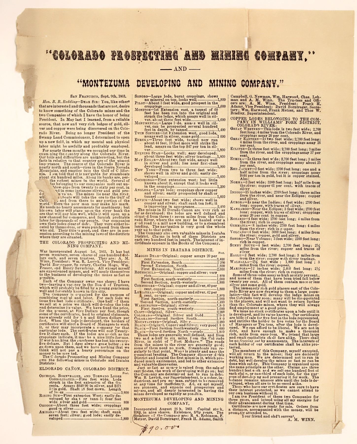 Very rare prospectus detailing Colorado prospecting and mining companies. Dated San Francisco, Sept. 9th, 1863. One page, 8 x 11 inches.