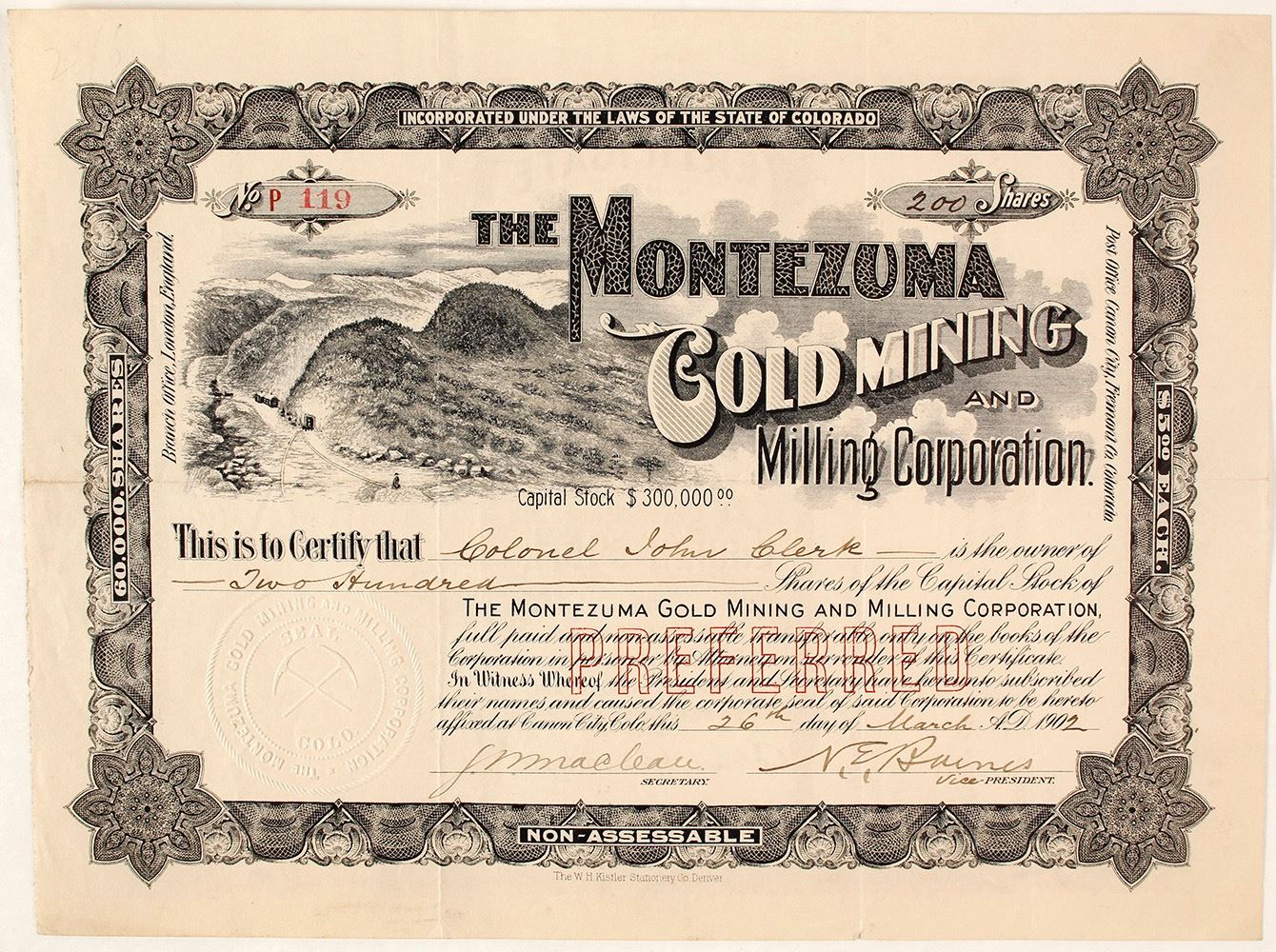 Inc. in Colorado. No. P119, issued for 200 shares to Colonel John Clery on March 26th, 1902. Signed by N.E. Barnes, vice-president, and J. Macleau, secretary. Not cancelled. Very attractive design with an ornate logo and vignette of hills with mine entrance. Printed by W.H. Kistler Stationery Co., Denver. Horizontal and vertical folds, some small separation. Very fine. Branch Office in London. Post Office in Canon City, Fremont County, Colorado. Not in Filer. The company was formed in 1901 by Noah E. Barnes and George Melville Boynton. They purchased 26 mining claims known as the Montezuma Group in the Hayden Creek Mining District near Coaldale. Eventually a town was established, Barnces City. However, it is believed Barnes "salted" the mine with high-grade ore from Cripple Creek in order to get more investors. The company did fail, and Barnes spent years in the Colorado State Penitentiary in Canon City. (Al Adams Gold Rush Memorabilia Collection) Date: Location: Hayden Creek Mining District, Colorado HWAC# 58531