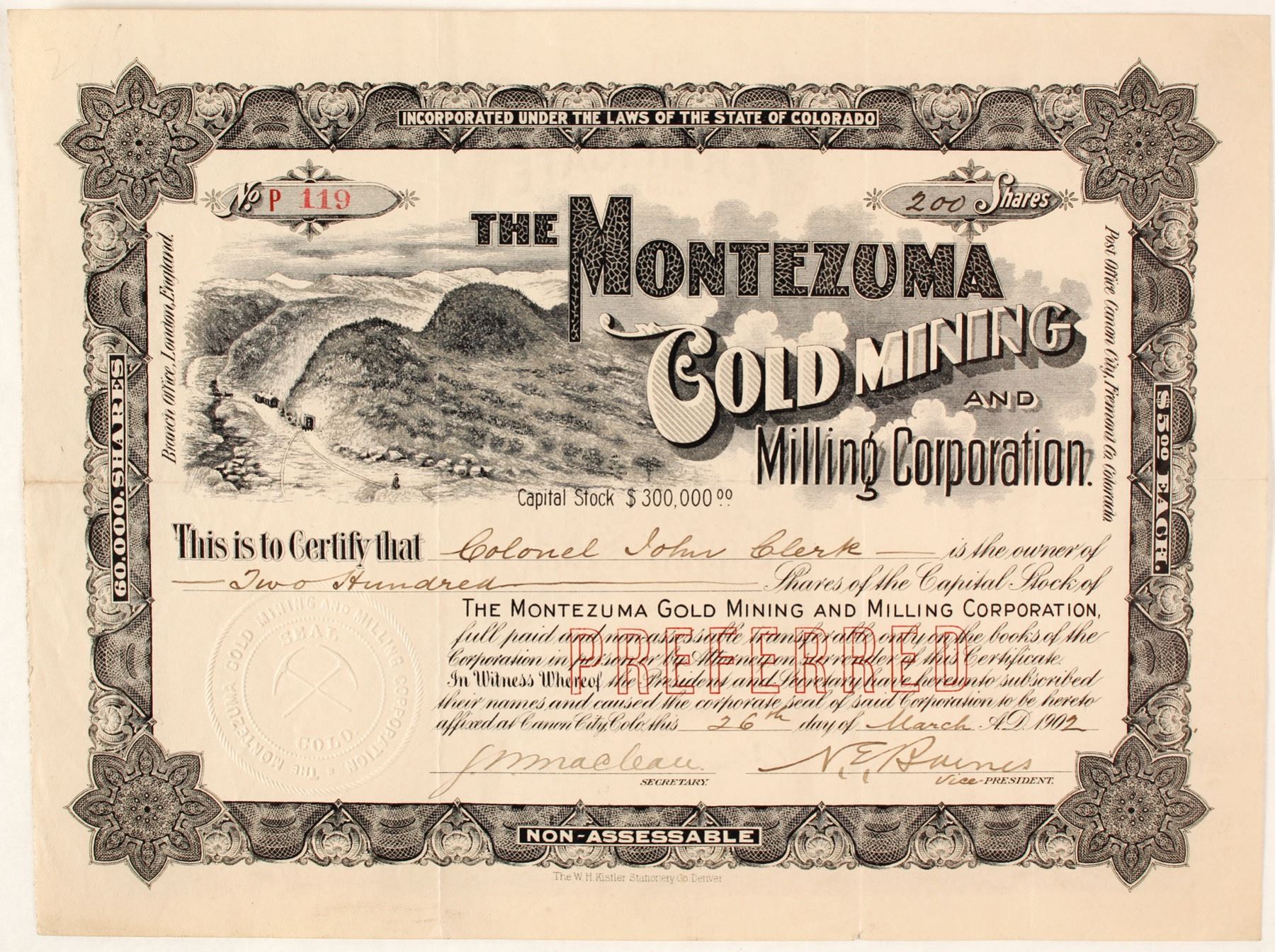 Inc. in Colorado. No. P119, issued for 200 shares to Colonel John Clery on March 26th, 1902. Signed by N.E. Barnes, vice-president, and J. Macleau, secretary. Not cancelled. Very attractive design with an ornate logo and vignette of hills with mine entrance. Printed by W.H. Kistler Stationery Co., Denver. Horizontal and vertical folds, some small separation. Very fine. Branch Office in London. Post Office in Canon City, Fremont County, Colorado. Not in Filer. The company was formed in 1901 by Noah E. Barnes and George Melville Boynton. They purchased 26 mining claims known as the Montezuma Group in the Hayden Creek Mining District near Coaldale. Eventually a town was established, Barnces City. However, it is believed Barnes "salted" the mine with high-grade ore from Cripple Creek in order to get more investors. The company did fail, and Barnes spent years in the Colorado State Penitentiary in Canon City. State: Colorado City: Hayden Creek Mining District Al Adams Collection. HWAC# 58531