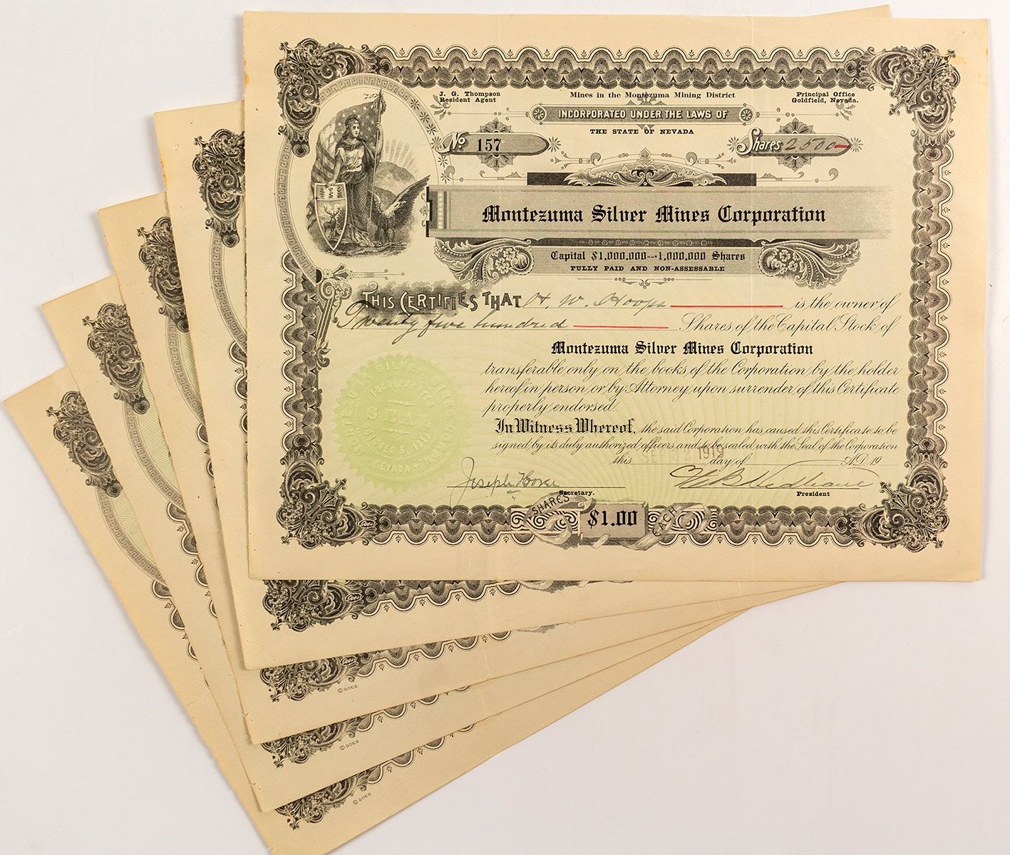 Nevada silver mine.5 Issued 1919-1920 to H. Hoops, 2500 shares ea., #157, 158, 290, 292, 293.. Signed by president. 8.25" x 10.75". Date: 1919 Location: Nevada HWAC# 52206