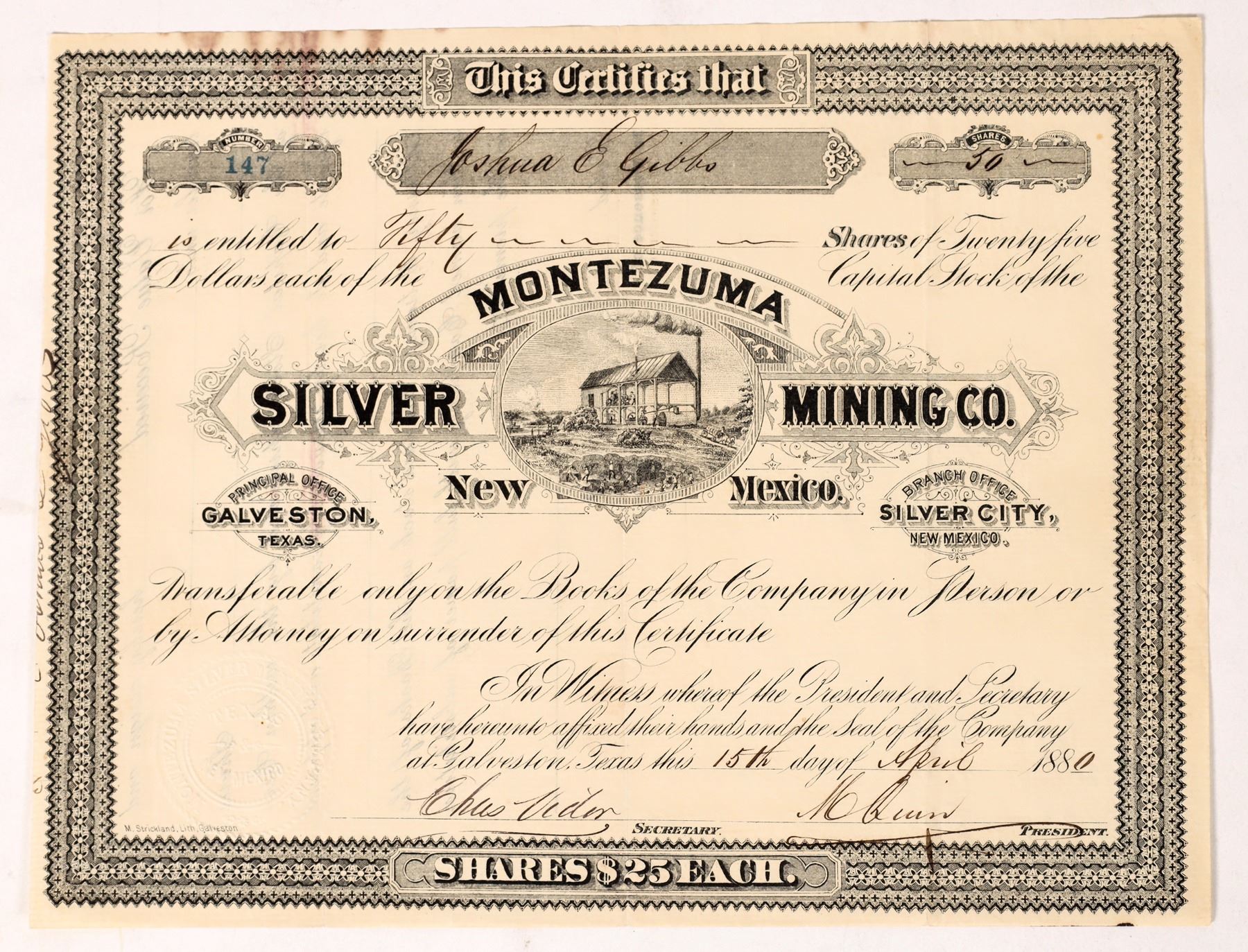 The Montezuma Silver Mining Company; incorporated in Silver City, New Mexico; Cert. no. 147 for 50 shares at $25 each issued to Joshua E. Gibbs on Apr 15, 1880 in Galveston, Texas. Signed by president M. Quin and secretary Chas. Viden. Not cancelled. Black border and print on beige paper by M. Strickland, Galveston. Vignette of a mine and milling operation, raised company seal stamped into paper, measures 8 x 10 inches.