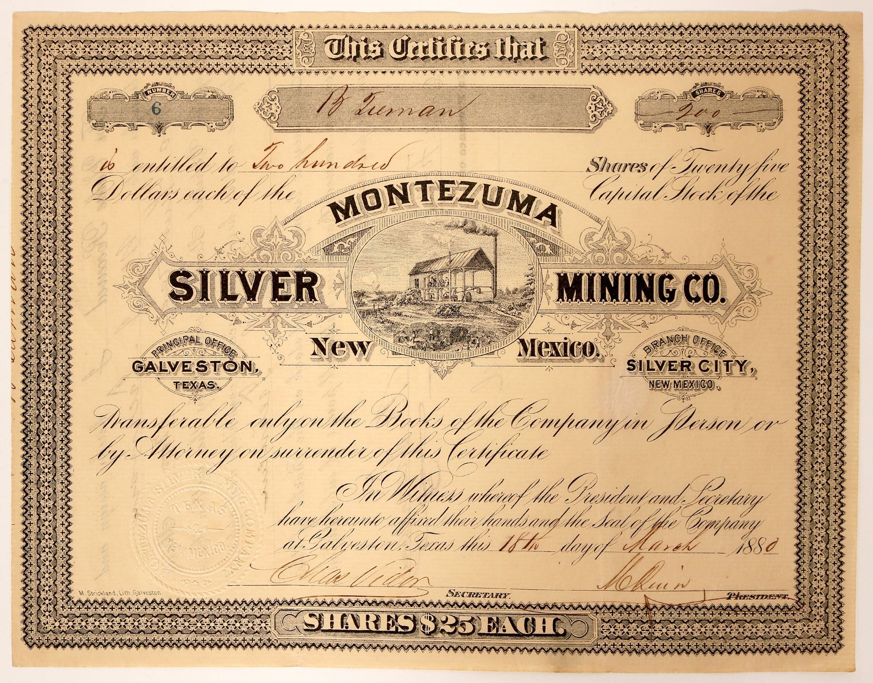 Very low No. 10, issued for 200 shares on March 18th, 1880 in Galveston, Texas top B Furman(?). . Signed by the president M Quin and secretary Charles (?). Principal Office in Galveston, Texas. Branch Office in Silver City, New Mexico. Mine at Silver City. Milling vignette. Pinholes. Otherwise extremely nice. 7.75 x 10" M Strickland of Galveston printer. Not cancelled. Ken Prag Collection