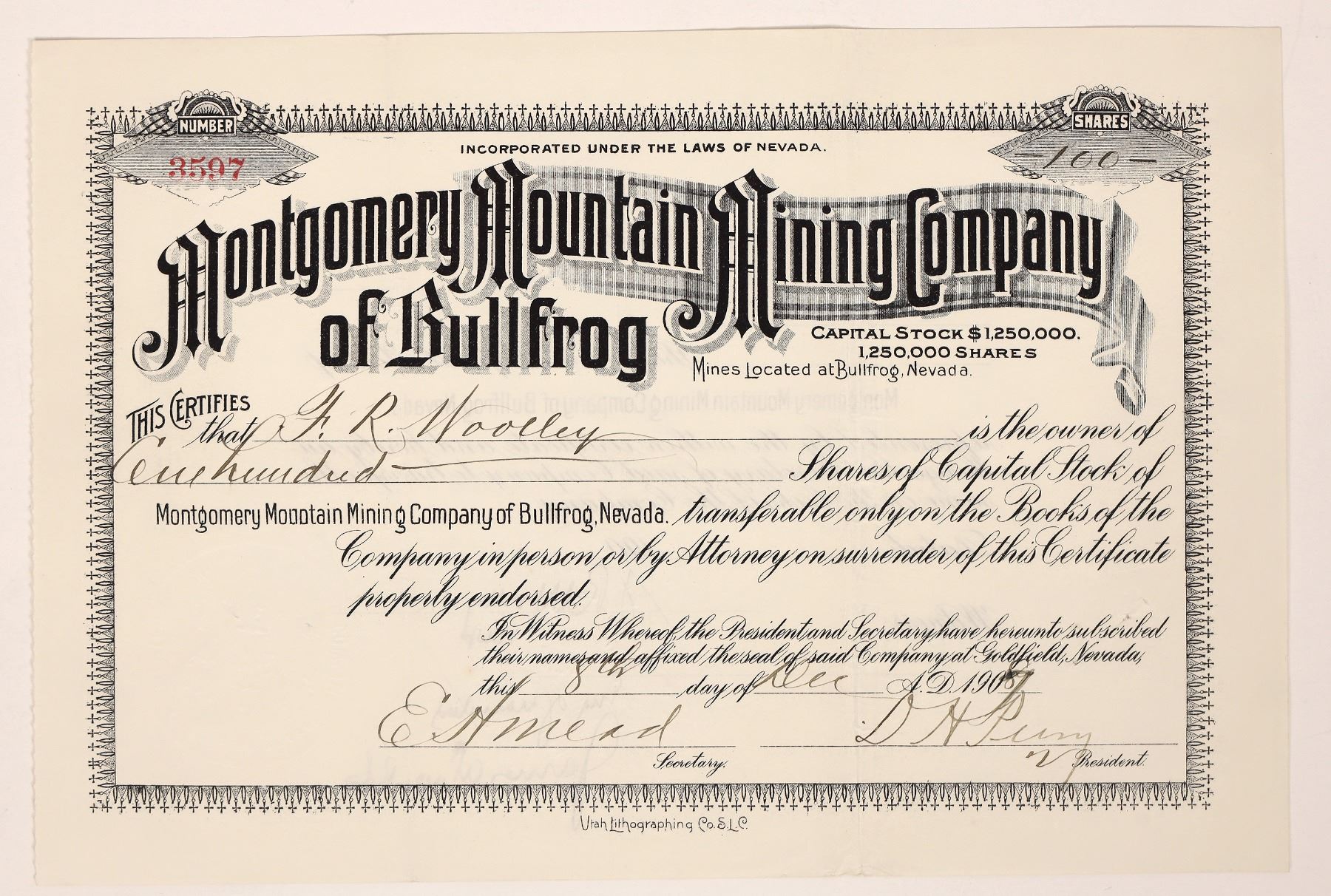 Issued 1908 Montgomery Mountain Mining of Bullfrog stock. Bullfrog Nevada Ken Prag Collection