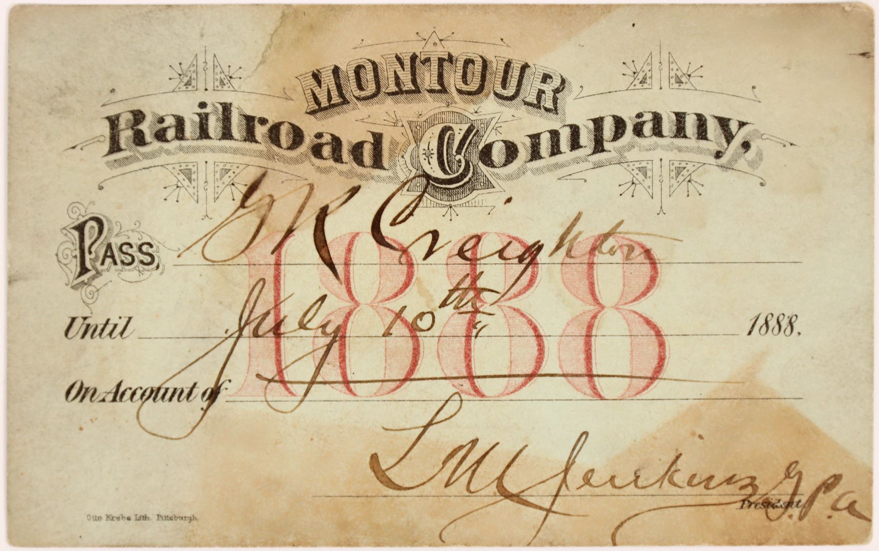 Pass issued for 1888 to GR Creighton. Signed by GPA LM Jenkins. Printed on green cardstock with black print and red date underprint. Reverse has small locomotive vignette. Otto Krebe Lith, Philadelphia. Toning and stains. Chartered in 1877 as a subsidiary of the Imperial Coal Company. Extended from the Pittsburgh and Lake Erie Railroad line at Montour Junction, near Coraopolis, Pennsylvania to the Imperial Coal Company mines at Imperial, Pennsylvania. Pennsylvania